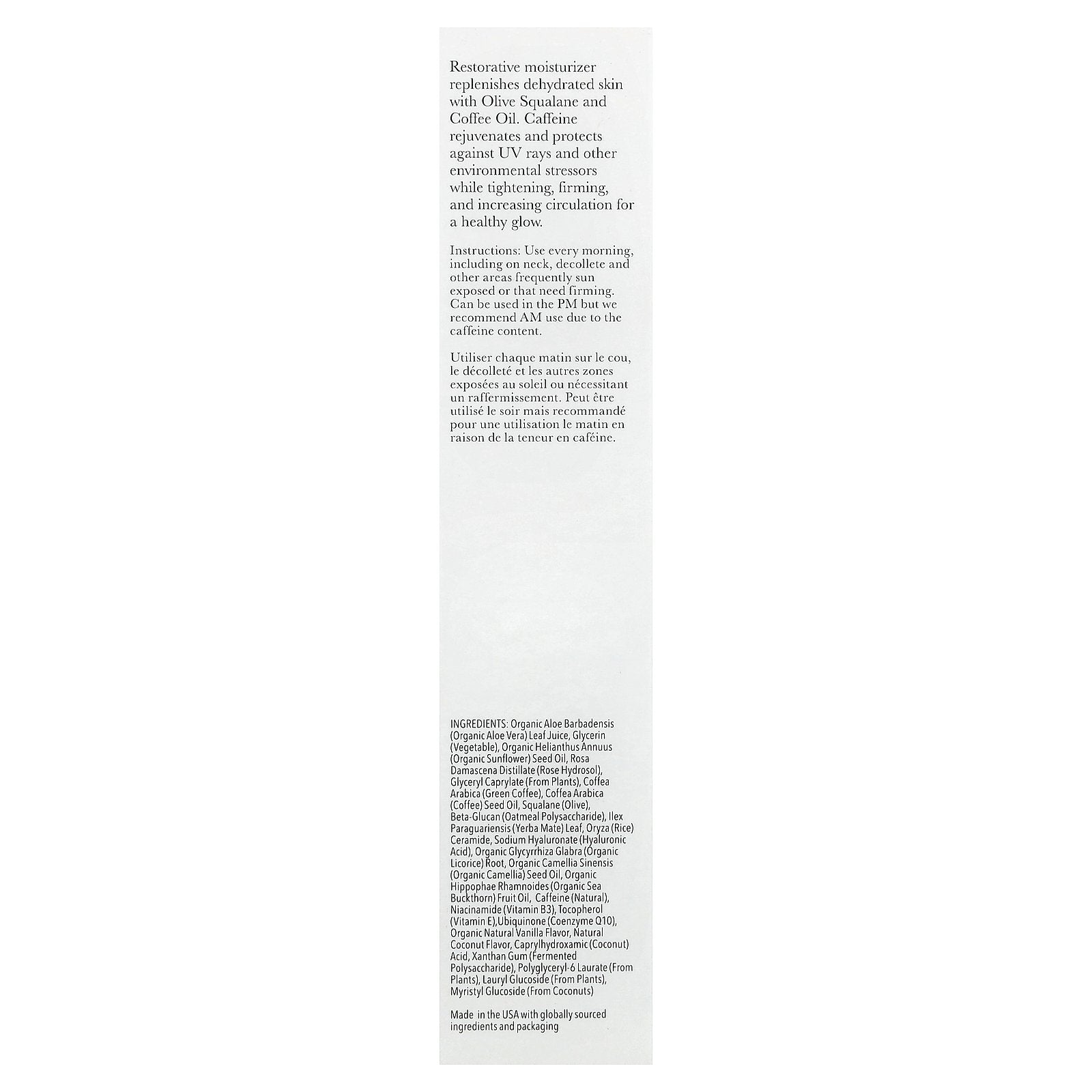 Organic aloe barbadensis (organic aloe vera) leaf juice, glycerin (vegetable), organic helianthus annuus (organic sunflower) seed oil, rosa damascena distillate (rose hydrosol), glyceryl caprylate (from plants), coffea arabica (green coffee), coffea arabica (coffee) seed oil, squalane (olive), beta-glucan (oatmeal polysaccharide), ilex paraguariensis (yerba mate) leaf, oryza (rice) ceramide, sodium hyaluronate (hyaluronic acid), organic glycyrrhiza glabra (organic licorice) root, organic camellia sinensis (organic camellia) seed oil, organic hippophae rhamnoides (organic sea buckthorn) fruit oil, caffeine (natural), niacinamide (vitamin b3), tocopherol (vitamin e), ubiquinone (coenzyme q10), organic natural vanilla flavor, natural coconut flavor, caprylhydroxamic (coconut) acid, xanthan gum (fermented polysaccharide), polyglyceryl-6 laurate (from plants), lauryl glucoside (from plants), myristyl glucoside (from coconuts).