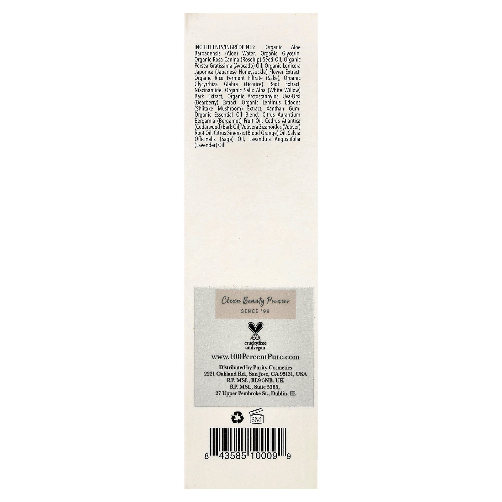 Organic aloe barbadensis (aloe) water, organic glycerin, organic rosa canina (rosehip) seed oil, organic persea gratissima (avocado) oil, organic lonicera japonica (Japanese honeysuckle) flower extract, organic rice ferment filtrate (sake), organic glycyrrhiza glabra (licorice) root extract, niacinamide, organic salix alba (white willow) bark extract, organic arctostaphylos uva-ursi (bearberry) extract, organic lentinus edodes shiitake mushroom) extract, xanthan gum, organic essential oil blend: citrus aurantium bergamia (bergamot) fruit oil, cedrus atlantica (cedarwood) bark oil, vetivera zizanoides (vetiver) root oil, citrus sinensis (blood orange) oil, salvia officinalis (sage) oil, lavandula angustifolia (lavender) oil.