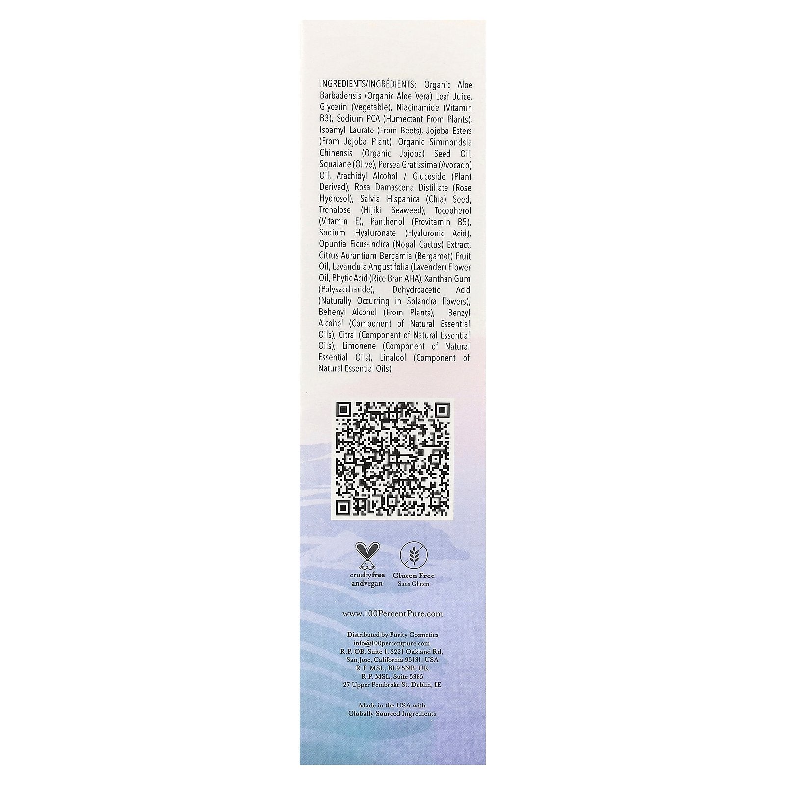 Organic aloe barbadensis (organic aloe vera) leaf juice, glycerin (vegetable), niacinamide (vitamin b3), sodium pca (humectant from plants), isoamyl laurate (from beets), jojoba esters (from jojoba plant), organic simmondsia chinensis (organic jojoba) seed oil, squalane (olive), persea gratissima (avocado) oil, arachidyl alcohol / glucoside (plant derived), rosa damascena distillate (rose hydrosol), salvia hispanica (chia) seed, trehalose (hijiki seaweed), tocopherol (vitamin e), panthenol (provitamin b5), sodium hyaluronate (hyaluronic acid), opuntia ficus-indica (nopal cactus) extract, citrus aurantium bergamia (bergamot) fruit oil, lavandula angustifolia (lavender) flower oil, phytic acid (rice bran aha), xanthan gum (polysaccharide), dehydroacetic acid (naturally occurring in solandra flowers), behenyl alcohol (from plants), benzyl alcohol (component of natural essential oils), citral (component of natural essential oils), limonene (component of natural essential oils), linalool (component of natural essential oils).