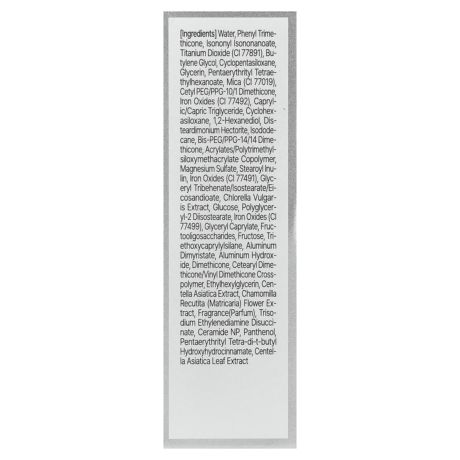Water, phenyl trimethicone, isononyl isononanoate, titanium dioxide (ci 77891), butylene glycol, cyclopentasiloxane, glycerin, pentaerythrityl tetraethylhexanoate, mica (ci 77019), cetyl peg/ppg-10/1 dimethicone, iron oxides (ci 77492), caprylic/capric triglyceride, cyclohexasiloxane, 1,2-hexanediol, disteardimonium hectorite, isododecane, bis-peg/ppg-14/14 dimethicone, acrylates/polytrimethylsiloxymethacrylate copolymer, magnesium sulfate, stearoyl inulin, iron oxides (ci 77491), glyceryl tribehenate/isostearate/eicosandioate, chlorella vulgaris extract, glucose, polyglyceryl-2 diisostearate, iron oxides (ci 77499), glyceryl caprylate, fructooligosaccharides, fructose, triethoxycaprylylsilane, aluminum dimyristate, aluminum hydroxide, dimethicone, cetearyl dimethicone/vinyl dimethicone crosspolymer, ethylhexylglycerin, centella asiatica extract, chamomilla recutita (matricaria) flower extract, fragrance (parfum), trisodium ethylenediamine disuccinate, ceramide np, panthenol, pentaerythrityl tetra-di-t-butyl hydroxyhydrocinnamate, centella asiatica leaf extract.