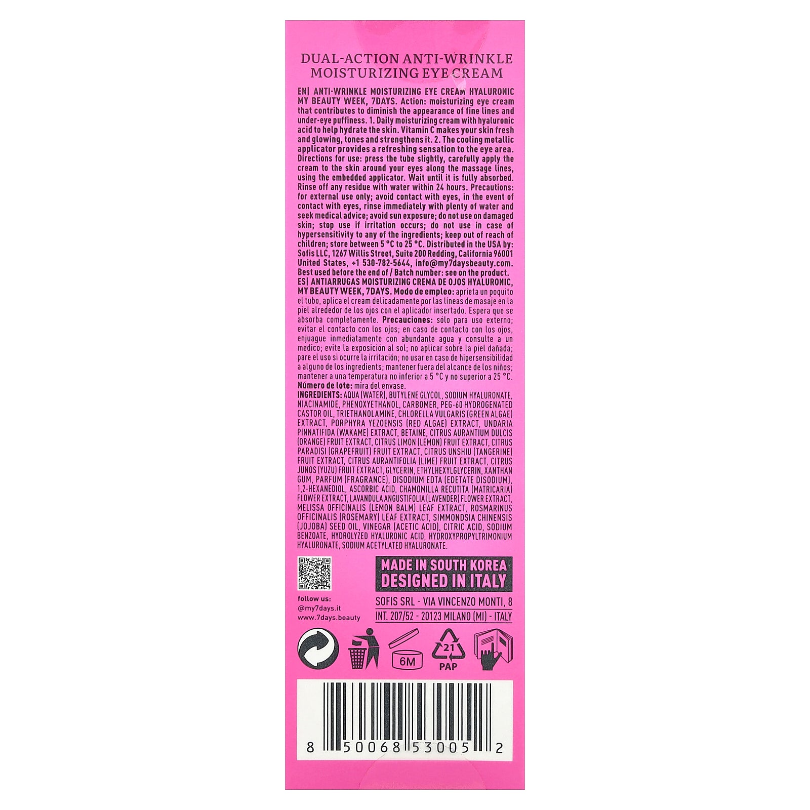 Action: moisturizing eye cream that contributes to diminish the appearance of fine lines and under-eye puffiness.