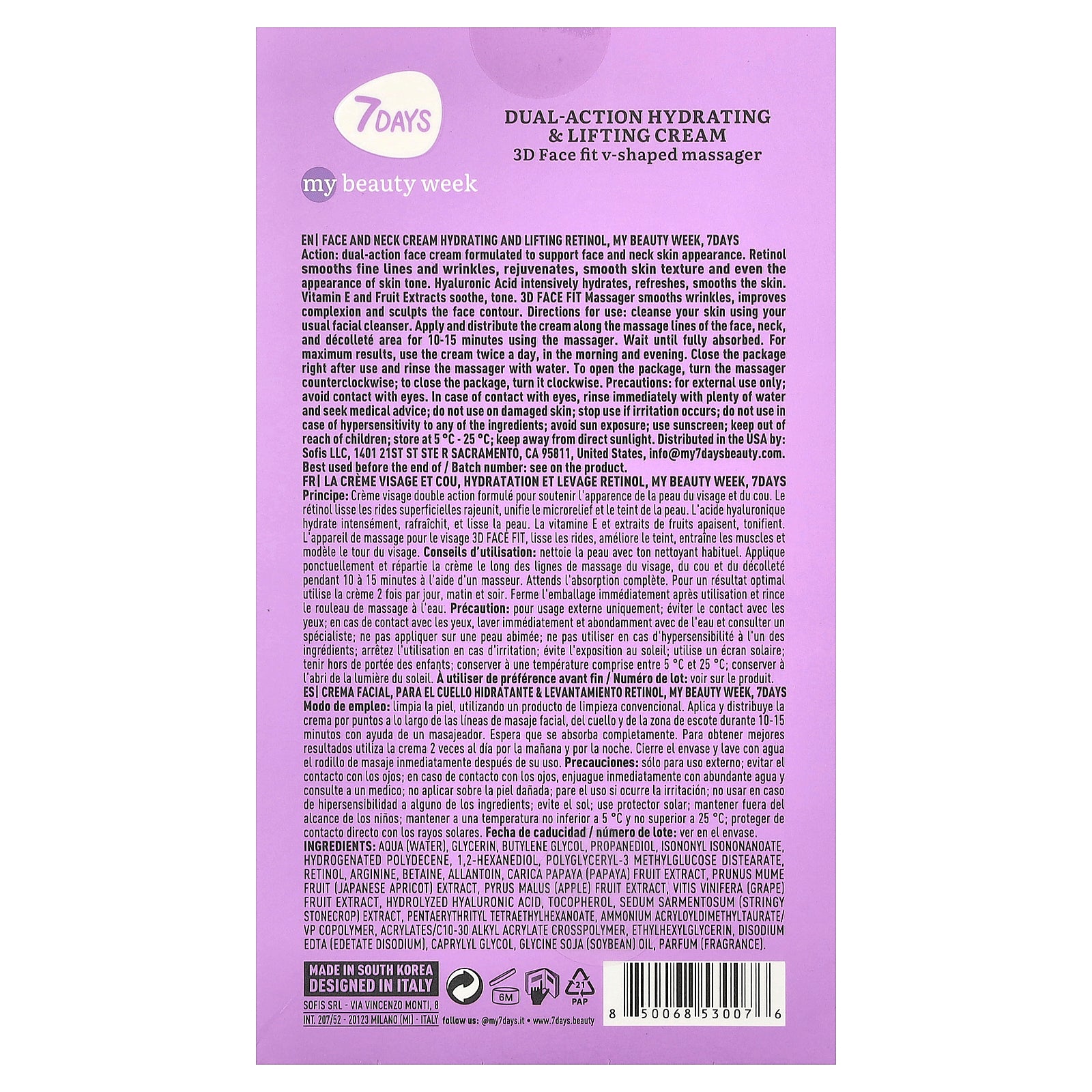 Dual-action face cream formulated to support face and neck skin appearance. Retinol smooths fine lines and wrinkles, rejuvenates, smooth skin texture and even the appearance of skin tone. Hyaluronic Acid intensively hydrates, refreshes, smooths the skin. Vitamin E and Fruit Extracts soothe, tone. 3D Face Fit Massager smooths wrinkles, improves complexion and sculpts the face contour.