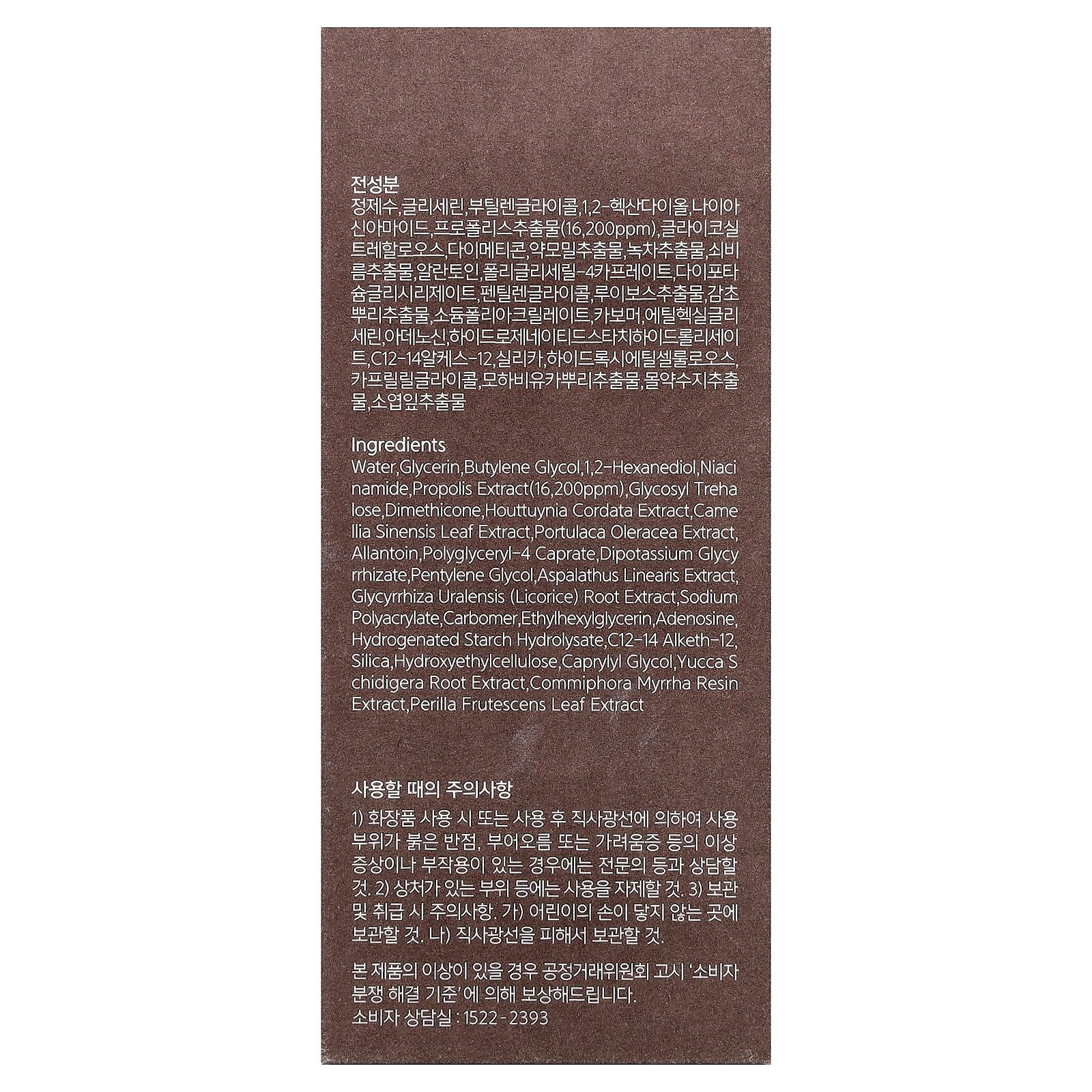 Water, glycerin, butylene glycol, 1,2-hexanediol, niacinamide, propolis extract (16,200ppm), glycosyl trehalose, dimethicone, houttuynia cordata extract, camellia sinensis leaf extract, portulaca oleracea extract, allantoin, polyglyceryl-4 caprate, dipotassium glycyrrhizate, pentylene glycol, aspalathus linearis extract. glycyrrhiza uralensis (licorice) root extract, sodium polyacrylate, carbomer, ethylhexylglycerin, adenosine, hydrogenated starch hydrolysate, c12-14 alketh-12, silica, hydroxyethylcellulose, caprylyl glycol, yucca schidigera root extract, commiphora myrrha resin extract, perilla frutescens leaf extract.