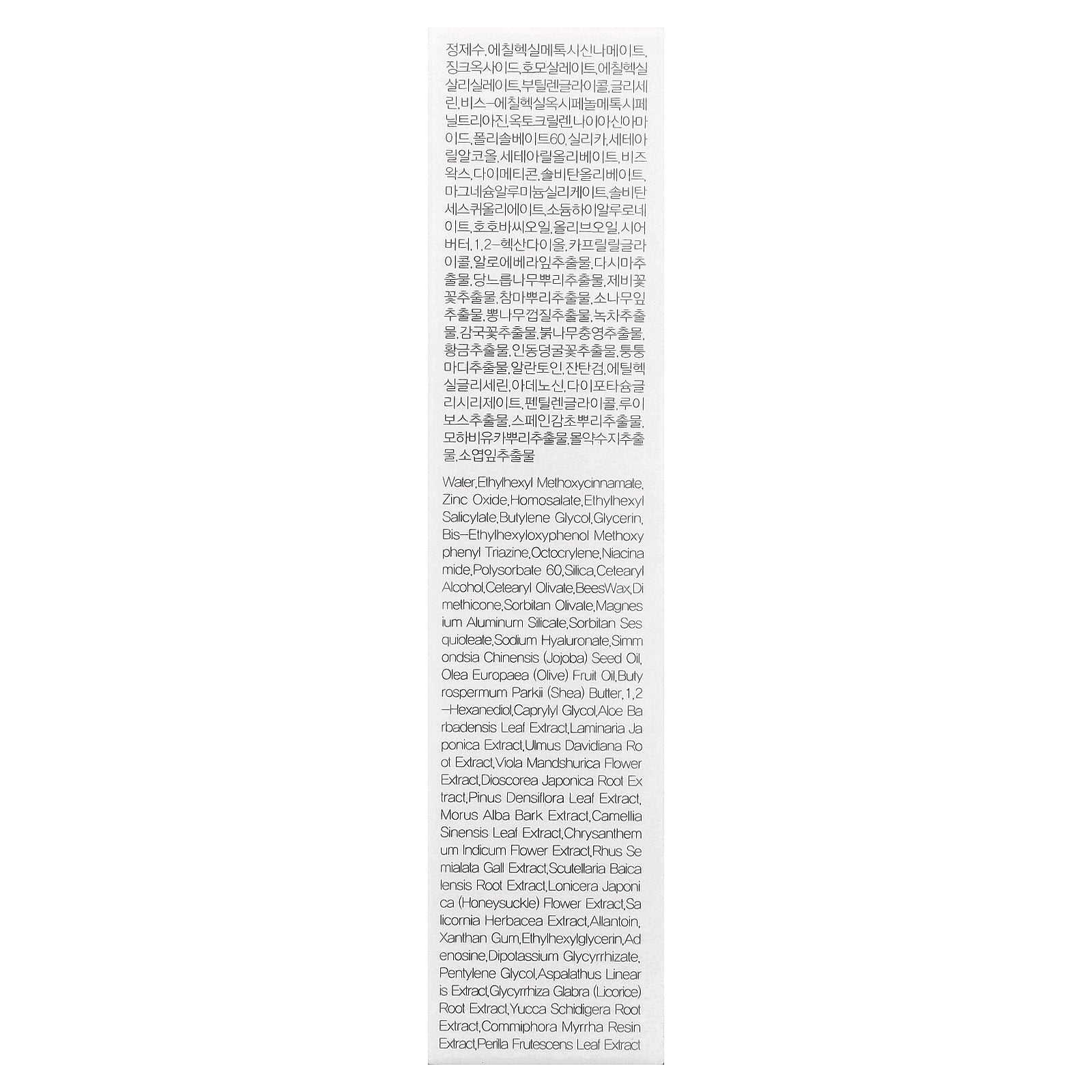 Water, ethylhexyl methoxycinnamate, zinc oxide, homosalate, ethylhexyl salicylate, butylene glycol, glycerin, bis-ethylhexyloxyphenol methoxyphenyl triazine, octocrylene, niacinamide, polysorbate 60, silica, cetearyl alcohol, cetearyl olivate, beeswax, dimethicone, sorbitan olivate, magnesium aluminum silicate, sorbitan sesquioleate, sodium hyaluronate, simmondsia chinensis (jojoba) seed oil, olea europaea (olive) fruit oil, butyrospermum parkii (shea) butter, 1,2 -hexanediol, caprylyl glycol, aloe barbadensis leaf extract, laminaria japonica extract, ulmus davidiana root extract, viola mandshurica flower extract, dioscorea japonica root extract, pinus densiflora leaf extract, morus alba bark extract, camellia sinensis leaf extract, chrysanthemum indicum flower extract, rhus semialata gall extract, scutellaria baicalensis root extract, lonicera japonica (honeysuckle) flower extract, salicornia herbacea extract, allantoin, xanthan gum, ethylhexylglycerin, adenosine, dipotassium glycyrrhizate, pentylene glycol, aspalathus linearis extract, glycyrrhiza glabra (licorice) root extract, yucca schidigera root extract, commiphora myrrha resin extract, perilla frutescens leaf extract.