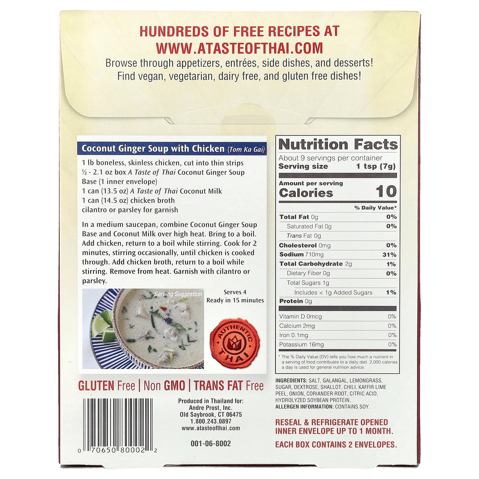 - 1/2 - 2.1 oz box A Taste of Thai Coconut Ginger Soup Base (1 inner envelope)