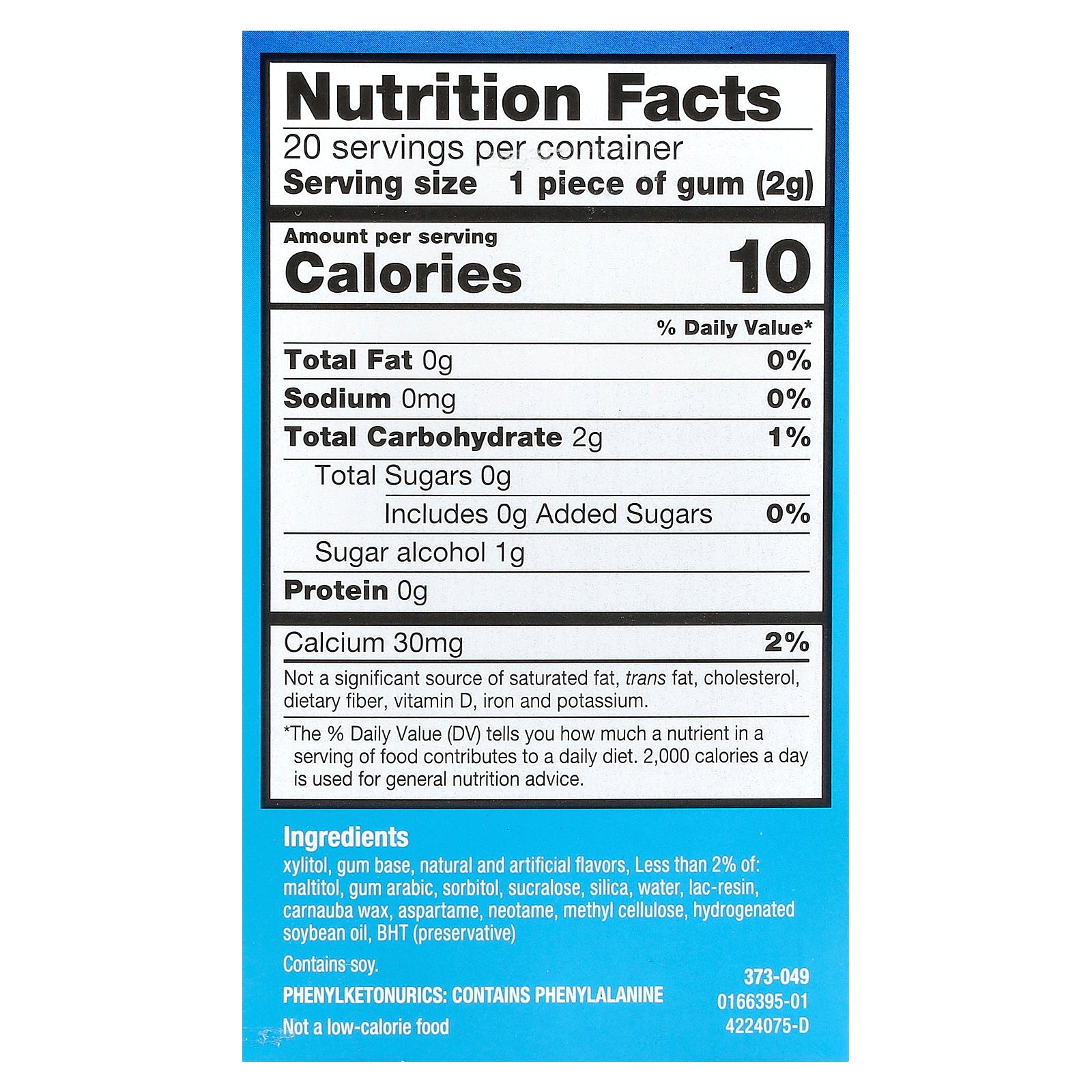 Xylitol, gum base, natural and artificial flavors, less than 2% of: maltitol, gum arabic, sorbitol, sucralose, titanium dioxide (color), silica, water, lac-resin, carnauba wax, aspartame, neotame, methyl cellulose, hydrogenated soybean oil, bht (preservative).