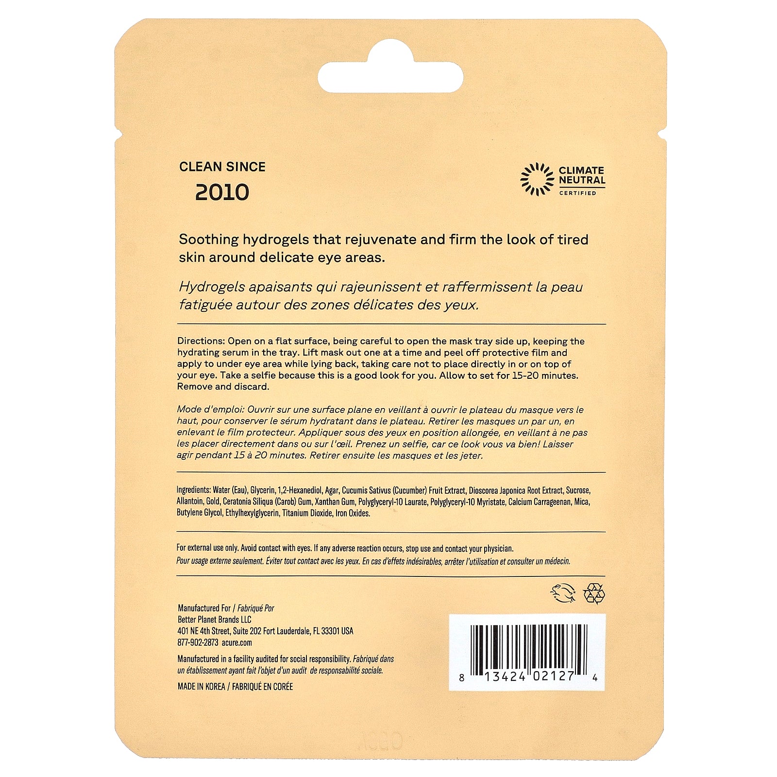 Open on a flat surface, being careful to open the mask tray side up, keeping the hydrating serum in the tray. Lift mask out one at a time and peel off protective film and apply to under eye area while lying back, taking care not to place directly in or on top of your eye. Take a selfie because this is a good look for you. Allow to set for 15-20 minutes. Remove and discard.