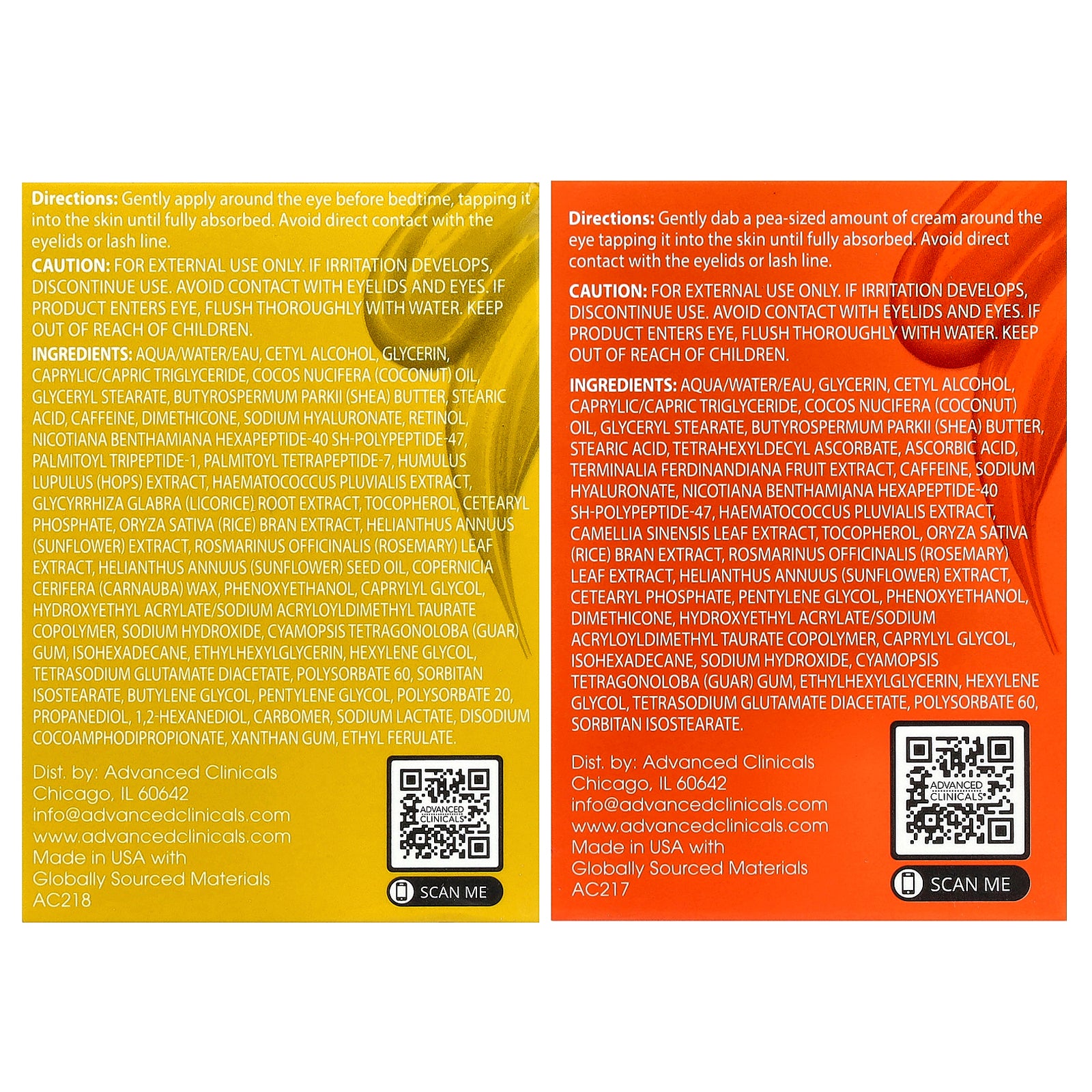 Brightening Vitamin C + Caffeine Eye Cream: Aqua/water/eau, glycerin, cetyl alcohol, caprylic/capric triglyceride, cocos nucifera (coconut) oil, glyceryl stearate, butyrospermum parkii (shea) butter, stearic acid, tetrahexyldecyl ascorbate, ascorbic acid, terminalia ferdinandiana fruit extract, caffeine, sodium hyaluronate, nicotiana benthamiana hexapeptide-40 sh-polypeptide-47, haematococcus pluvialis extract, camellia sinensis leaf extract, tocopherol, oryza sativa (rice) bran extract, rosmarinus officinalis (rosemary) leaf extract, helianthus annuus (sunflower) extract, cetearyl phosphate, pentylene glycol, phenoxyethanol, dimethicone, hydroxyethyl acrylate/sodium acryloyldimethyl taurate copolymer, caprylyl glycol, isohexadecane, sodium hydroxide, cyamopsis tetragonoloba (guar) gum, ethylhexylglycerin, hexylene glycol, tetrasodium glutamate diacetate, polysorbate 60, sorbitan isostearate.