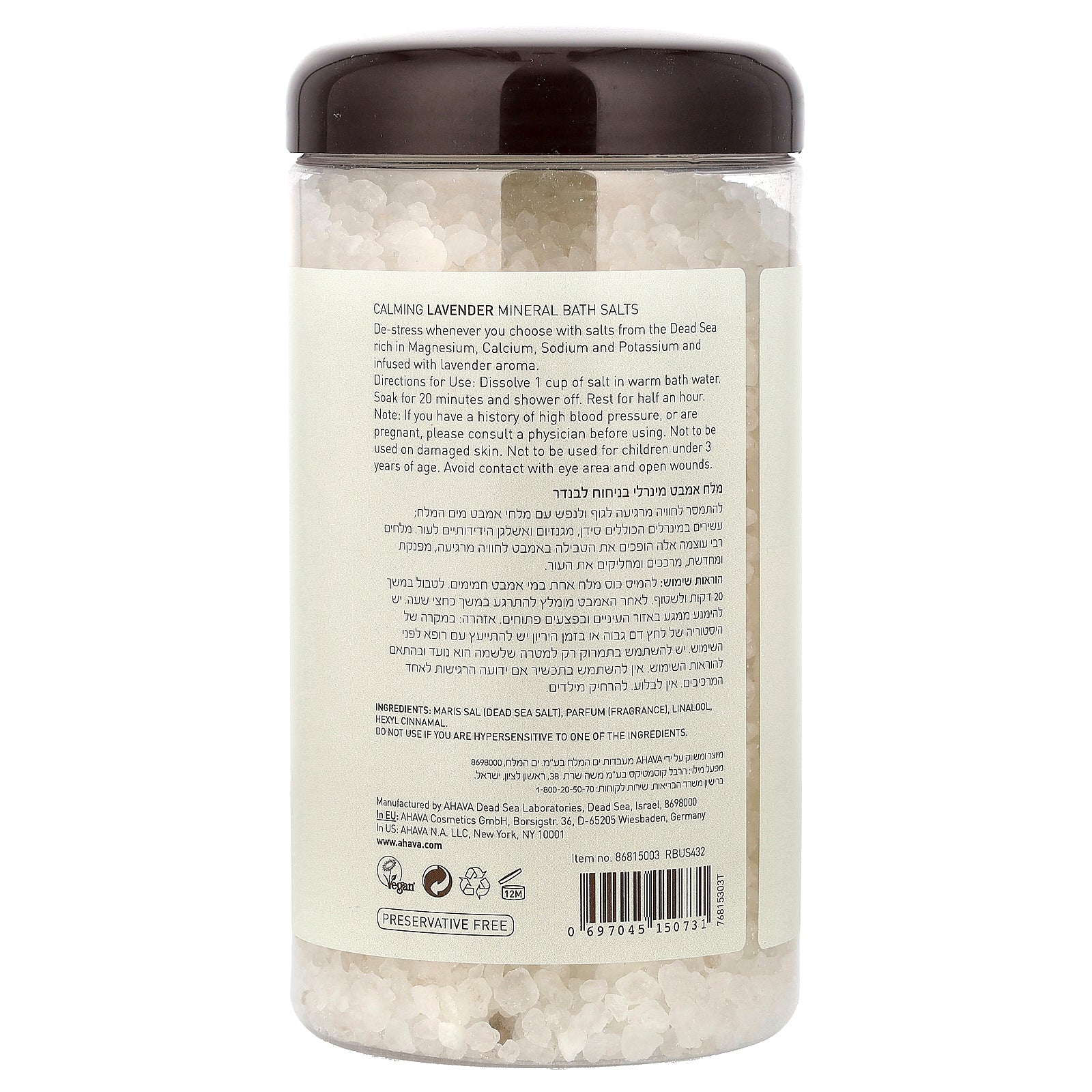 De-stress whenever you choose with salts from the Dead Sea rich in Magnesium, Calcium, Sodium and Potassium and infused with lavender aroma.