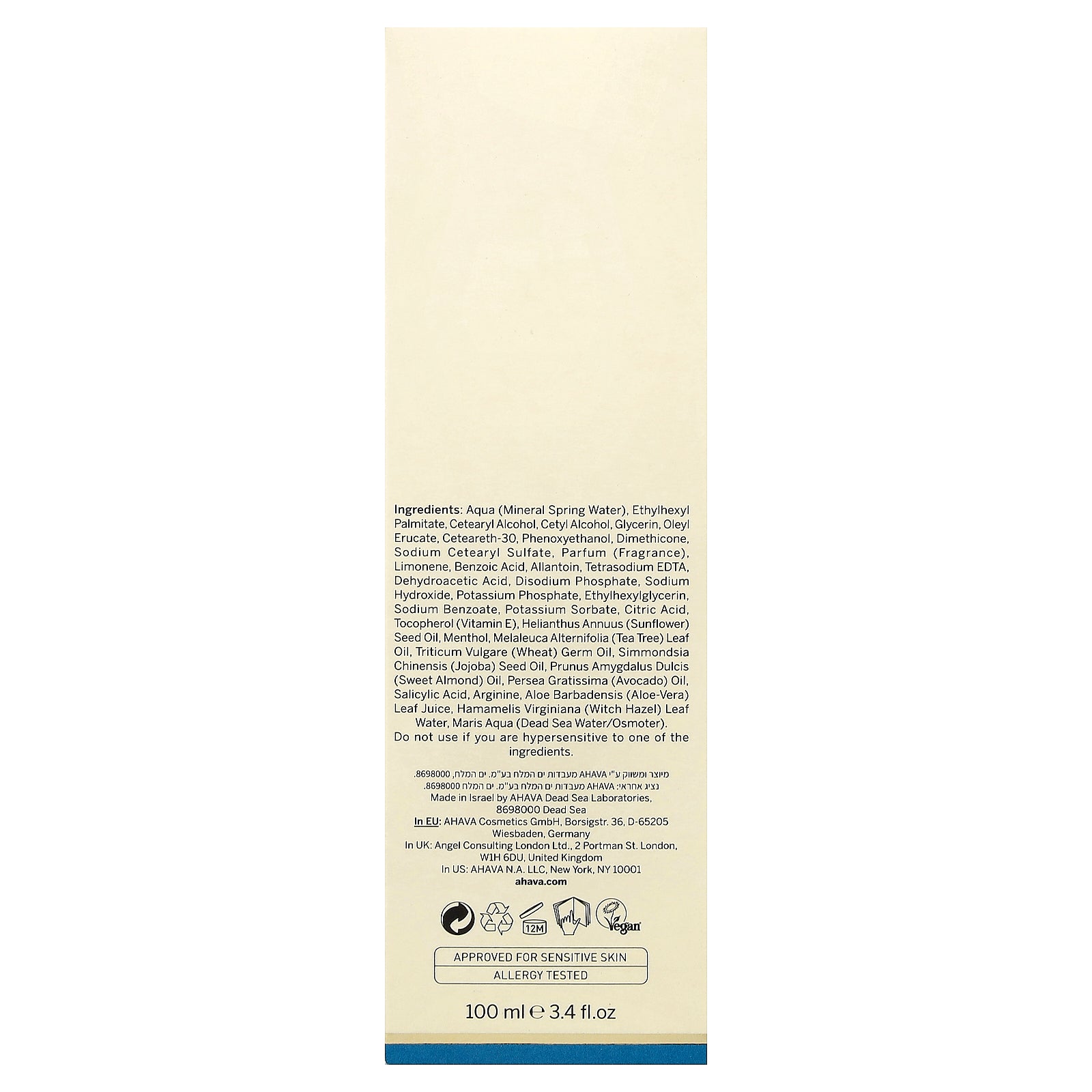 Aqua (mineral spring water), ethylhexyl palmitate, cetearyl alcohol, cetyl alcohol, glycerin, oleyl erucate, ceteareth-30, phenoxyethanol, dimethicone, sodium cetearyl sulfate, parfum (fragrance), limonene, benzoic acid, allantoin, tetrasodium edta, dehydroacetic acid, disodium phosphate, sodium hydroxide, potassium phosphate, ethylhexylglycerin, sodium benzoate, potassium sorbate, citric acid, tocopherol (vitamin e), helianthus annuus (sunflower) seed oil, menthol, melaleuca alternifolia (tea tree) leaf oil, triticum vulgare (wheat) germ oil, simmondsia chinensis (jojoba) seed oil, prunus amygdalus dulcis (sweet almond) oil, persea gratissima (avocado) oil, salicylic acid, arginine, aloe barbadensis (aloe-vera) leaf juice, hamamelis virginiana (witch hazel) leaf water, maris aqua (dead sea water/osmoter).