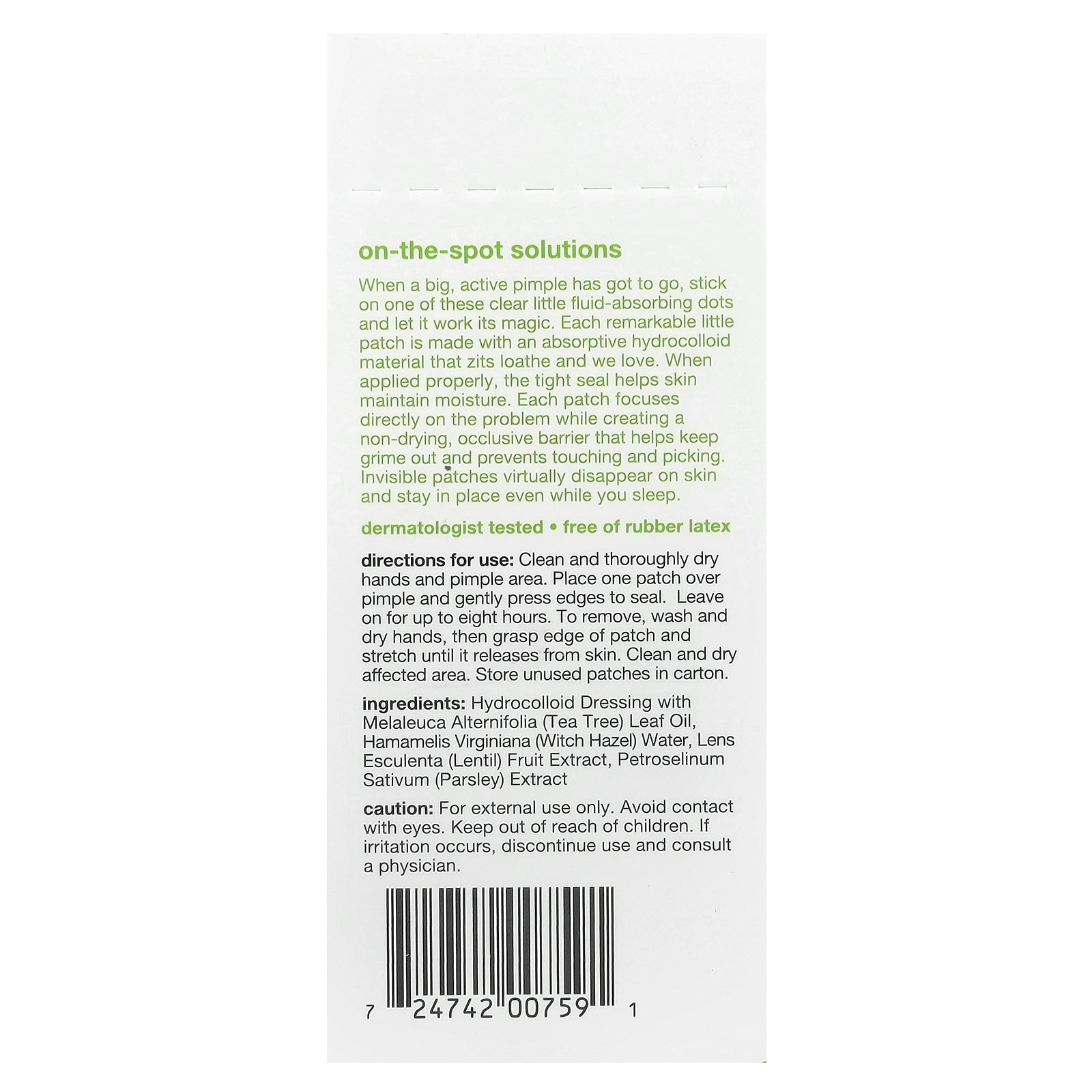 When a big, active pimple has got to go, stick on one of these clear little fluid absorbing dots and let it work its magic. Each remarkable little patch is made with an absorptive hydrocolloid material that zits loathe and we love. When applied properly, the tight seal helps skin maintain moisture. Each patch focuses directly on the problem while creating a non-drying, occlusive barrier that helps keep grime out and prevents touching and picking. Invisible patches virtually disappear on skin and stay in place even while you sleep.