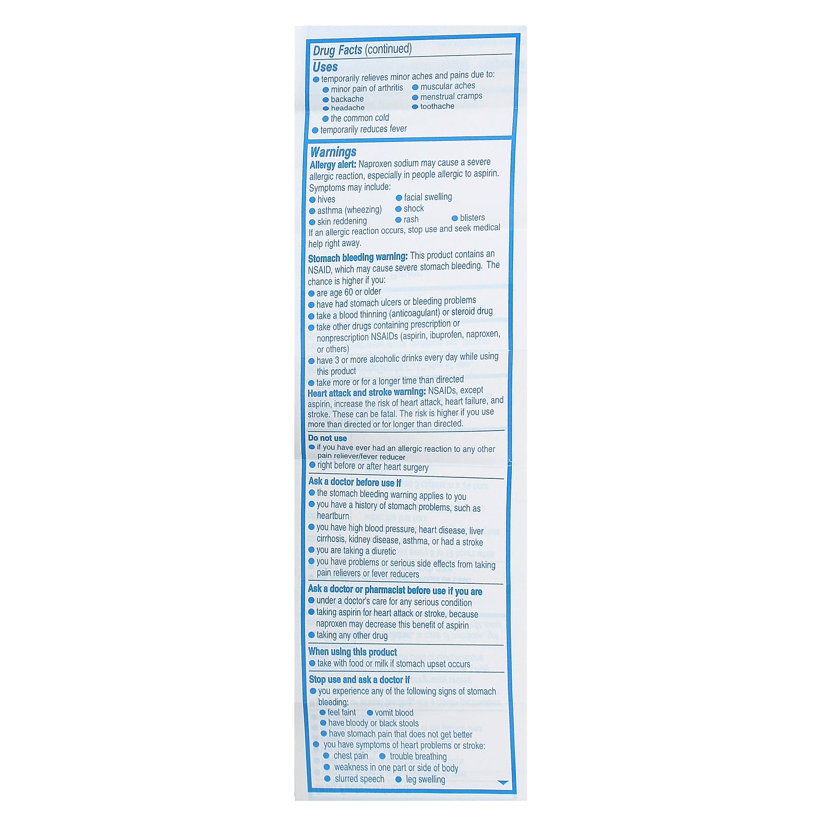 Heart attack and stroke warning: NSAIDs, except aspirin, increase the risk of heart attack, heart failure, and stroke. These can be fatal. The risk is higher if you use more than directed or for longer than directed.