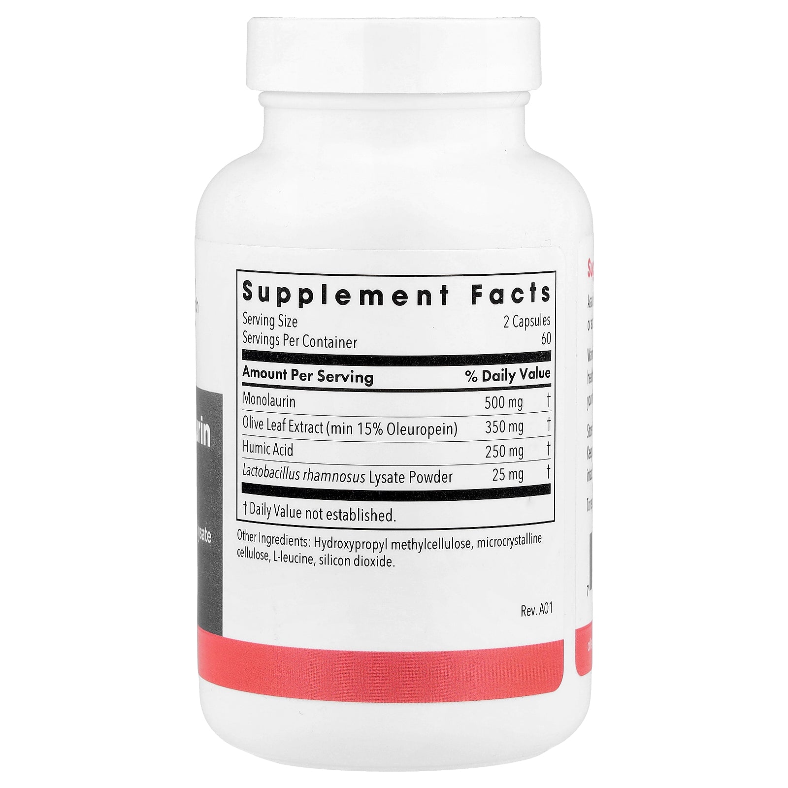 Humic-Monolaurin Complex combines a specially extracted and purified humic acid with monolaurin, olive leaf extract, and Lactobacillus rhamnosus cell wall fragments.