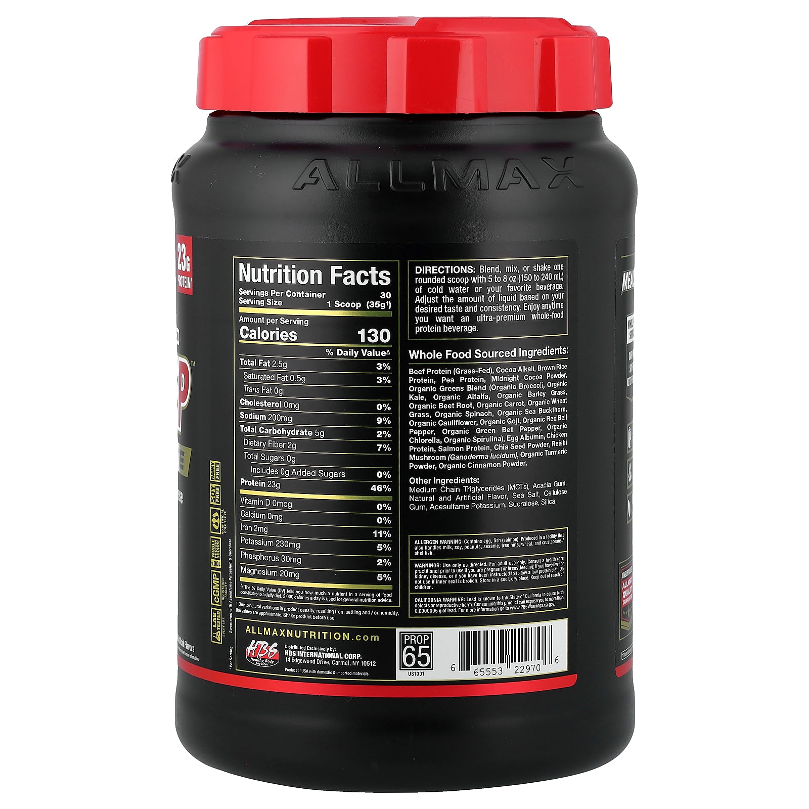 Whoe food sourced ingredients: Beef protein (grass-fed), cocoa alkali, brown rice protein, pea protein, midnight cocoa powder, organic greens blend (organic broccoli, organic kale, organic alfalfa, organic barley grass, organic beet root, organic carrot, organic wheat grass, organic spinach, organic sea buckthorn, organic cauliflower, organic goji, organic red bell pepper, organic green bell pepper, organic chlorella, organic spirulina), egg albumin, chicken protein, salmon protein, chia seed powder, reishi mushroom (ganoderma lucidum), organic turmeric powder, organic cinnamon powder.