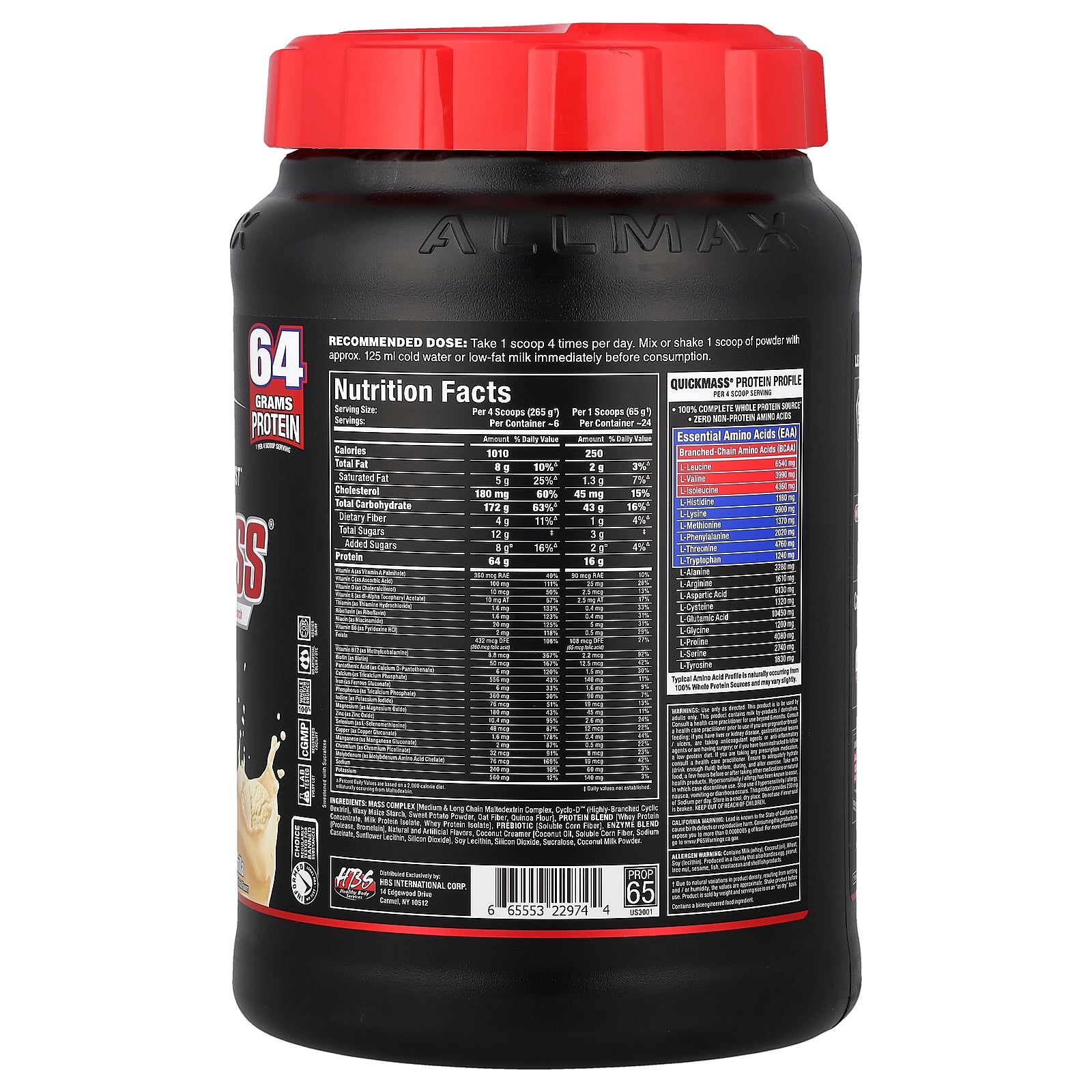 University Research-Based Science For Maximum Mass: Quickmass® Packs 1010 Mass-Building Calories into every serving in cold water, no milk required! During one 8-week Gold-Standard (double-blind, placebo-controlled) study conducted at California State University, test subjects provided the same calorie content as 2 servings of Quickmass® per day gained 4.5 times as much fat-free mass and increased chest size by 1 inch.