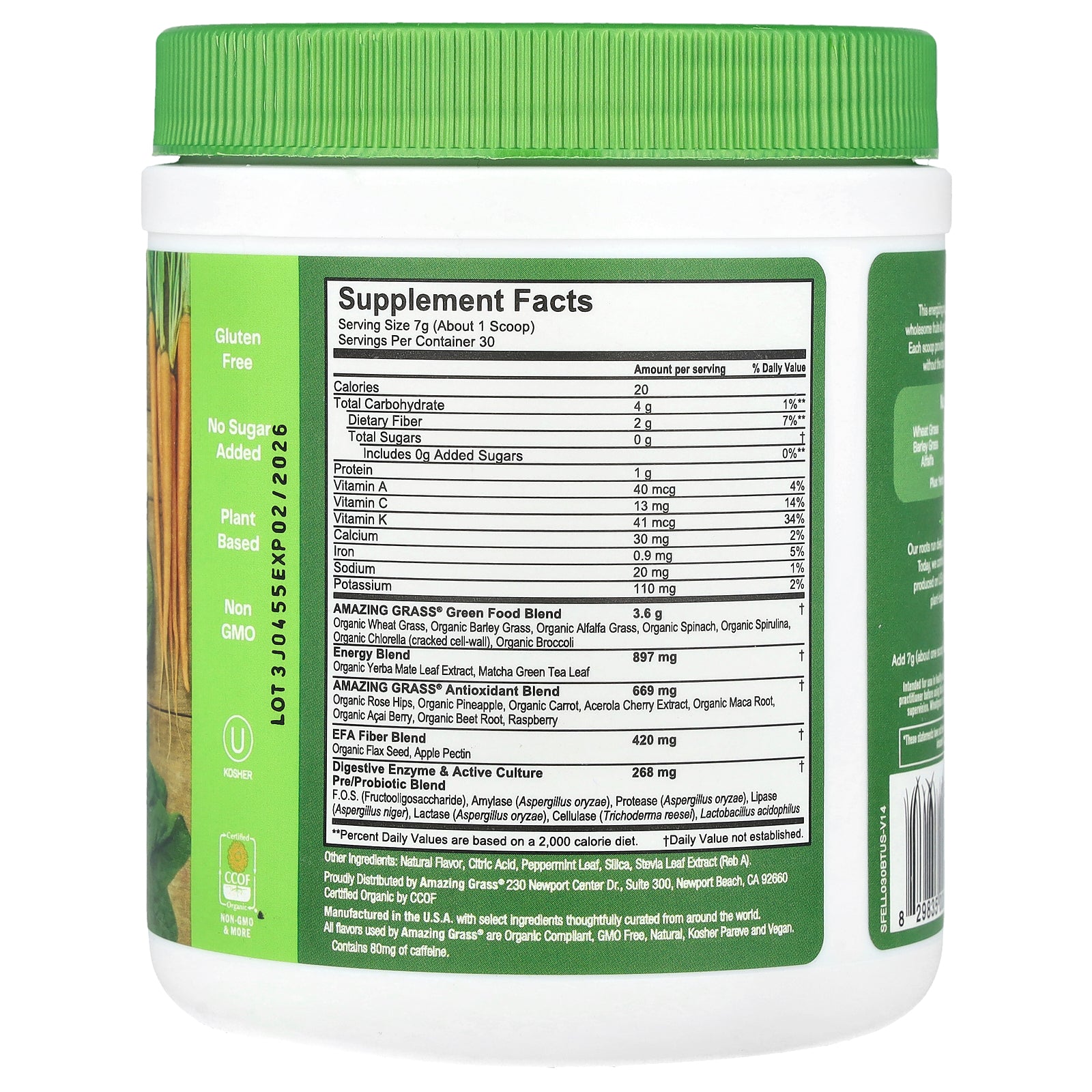 Amazing Grass® Green Food Blend Organic Wheat Grass, Organic Barley Grass, Organic Alfalfa Grass, Organic Spinach, Organic Spirulina, Organic Chlorella (cracked cell-wall), Organic Broccoli |
