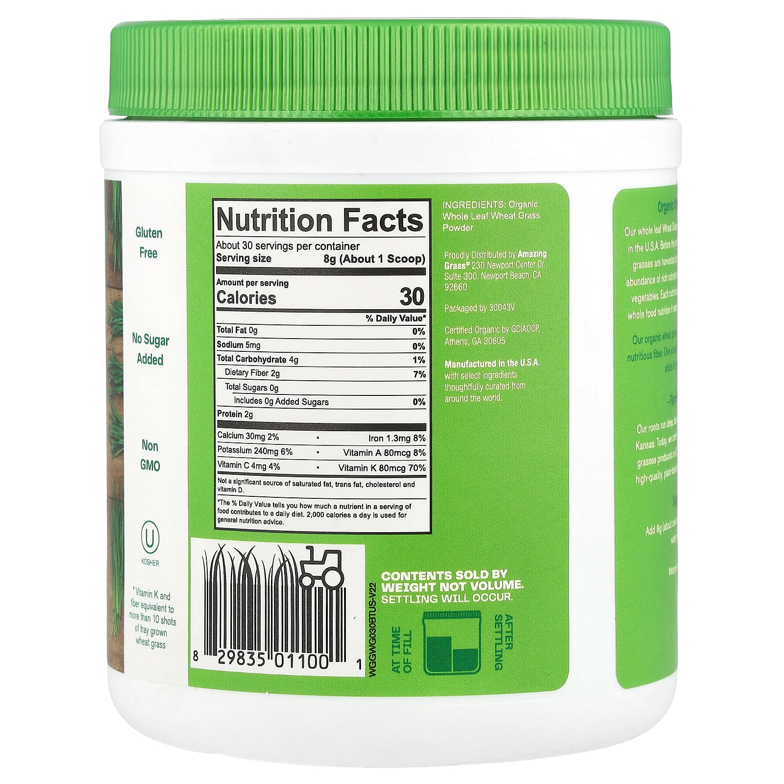 Our organic wheat grass is whole leaf, not juiced, maintaining nutritious fiber. One scoop is the fiber equivalent of more than 10 shots of tray-grown wheat grass.