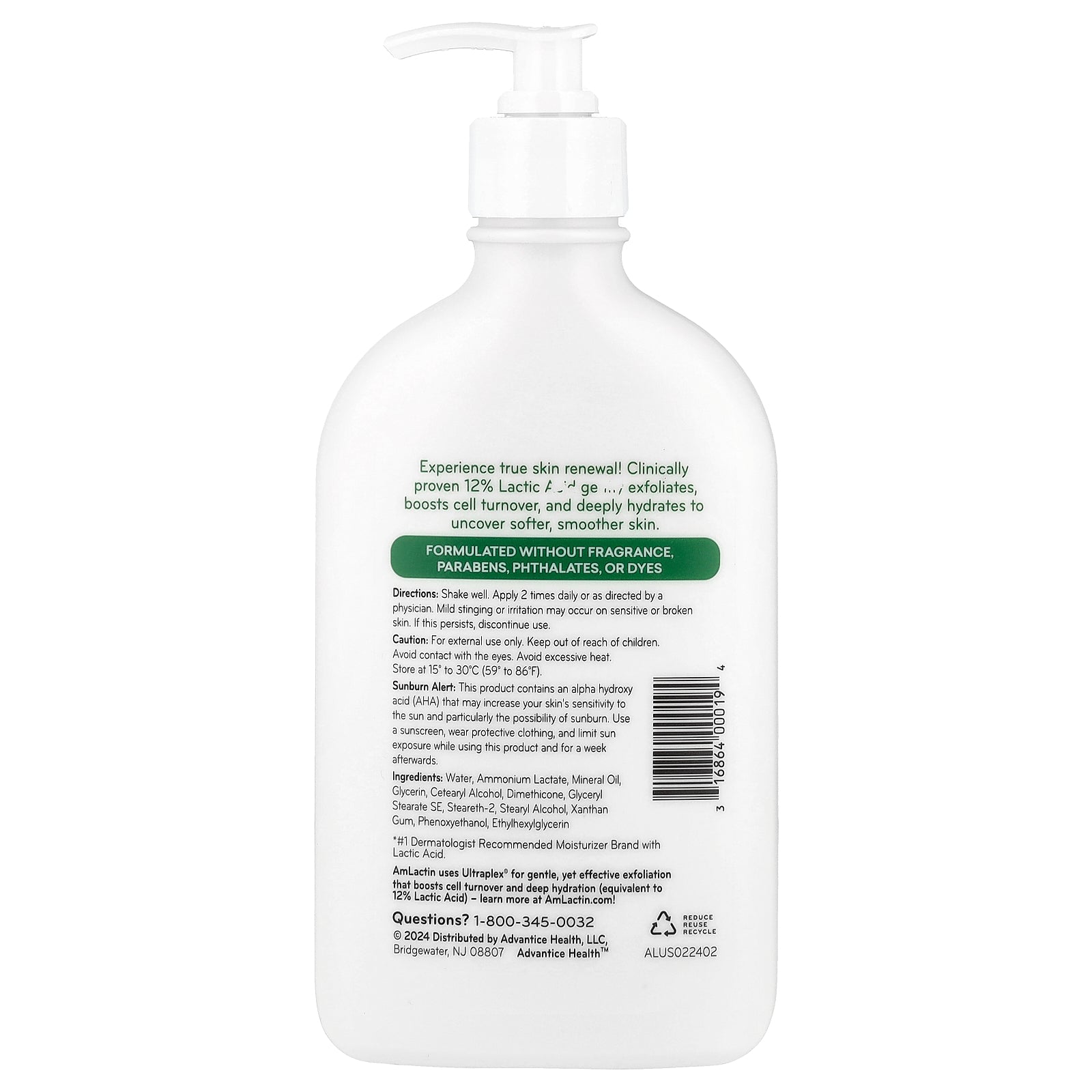 AmLactin uses Ultraplex® for gentle, yet effective exfoliation that boosts cell turnover and deep hydration (equivalent to 12% Lactic Acid)