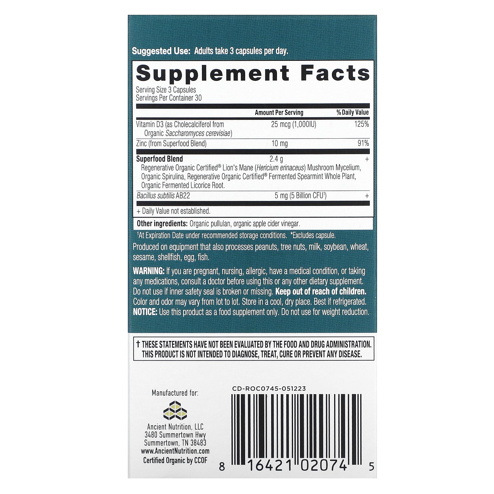 | Superfood Blend Regenerative Organic Certified® Lion's Mane (Hericium erinaceus) Mushroom Mycelium, Organic Spirulina, Regenerative Organic Certified® Fermented Spearmint Whole Plant, Organic Fermented Licorice Root. |