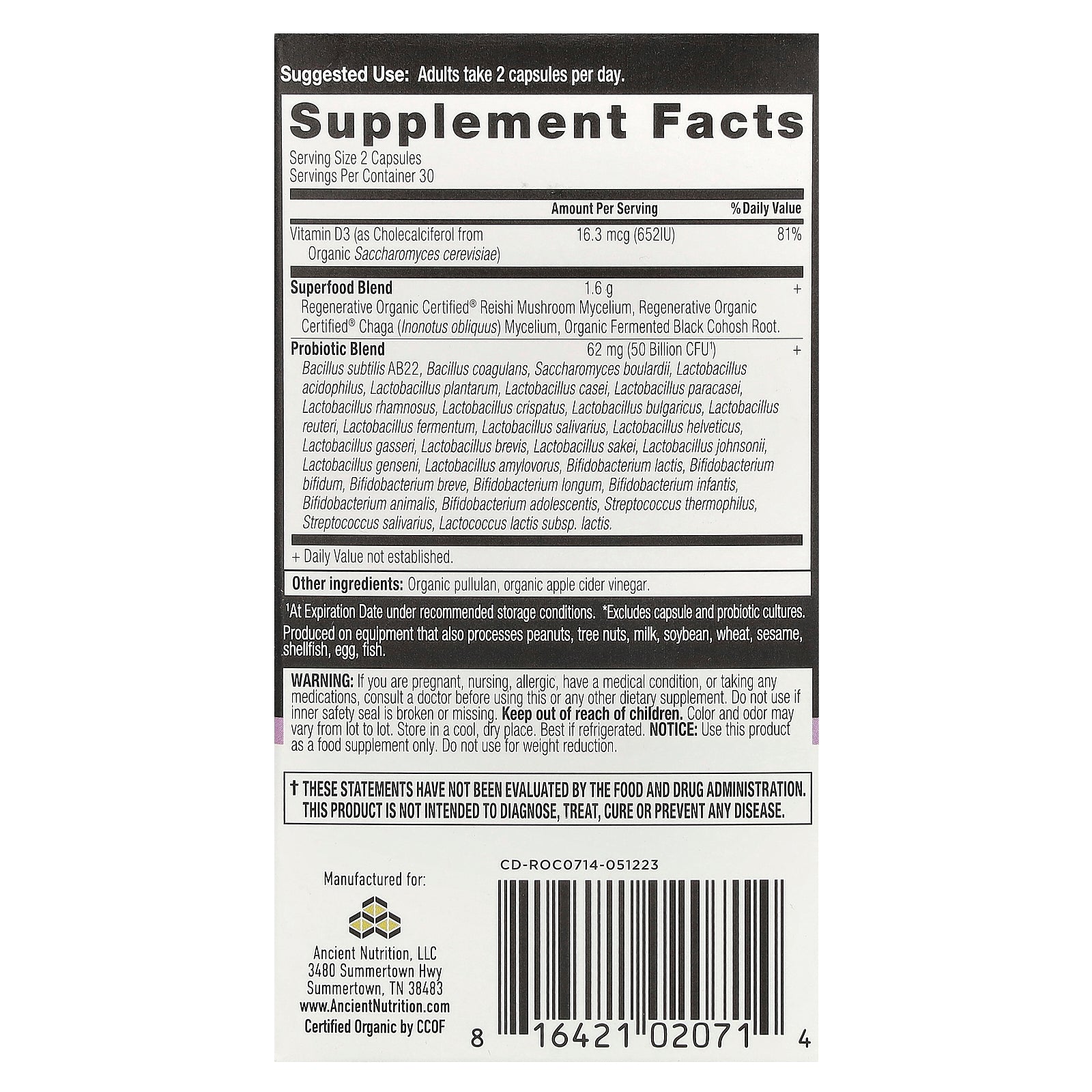 Superfood Blend Regenerative Organic Certified® Reishi Mushroom Mycelium, Regenerative Orgainc Certified® Chaga (Inonotus obliquus) Mycelium, Organic Fermented Black Cohosh Root. |