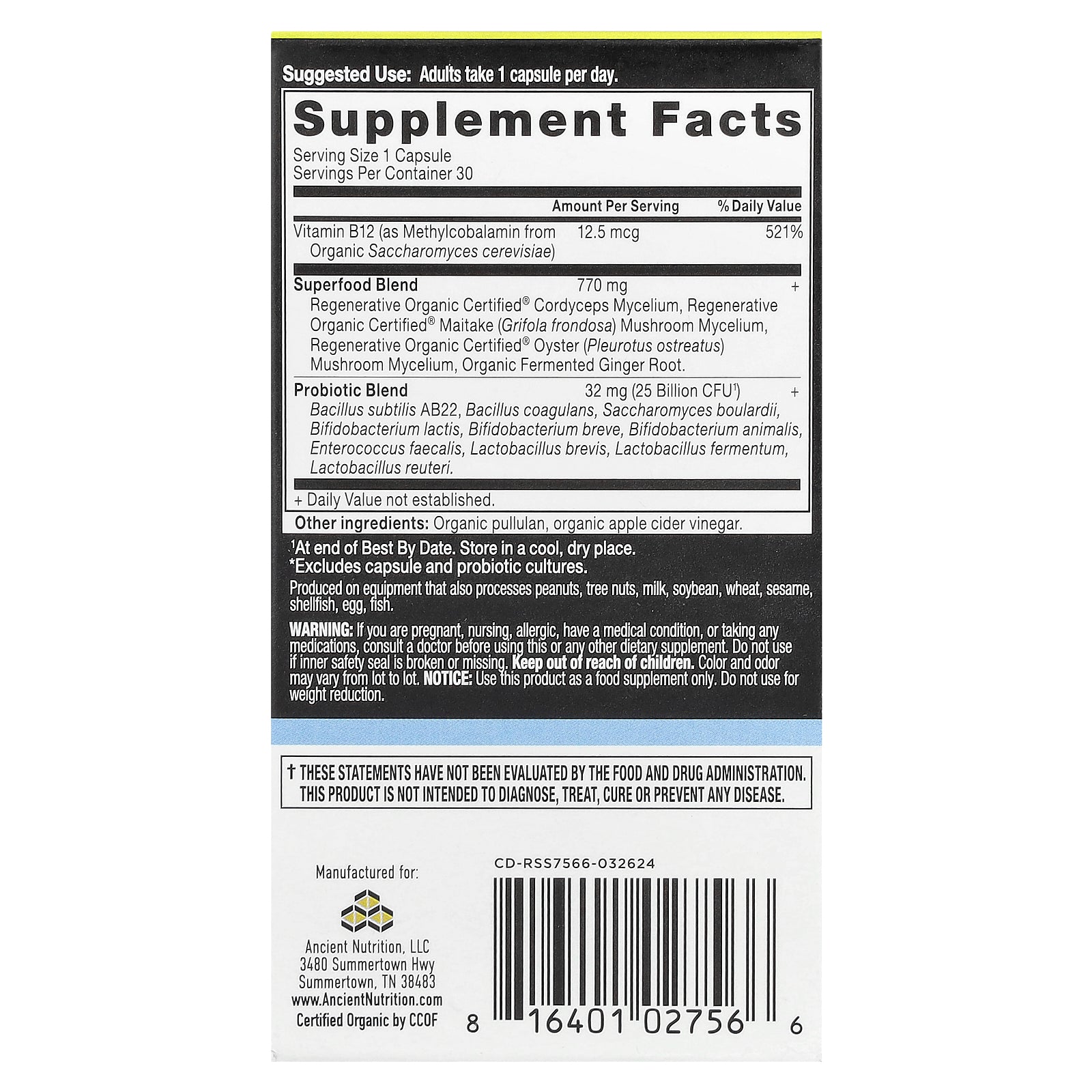 Superfood Blend Regenerative Organic Certified® Cordyceps Mycelium, Regenerative Organic Certified®, Maitake (Grifola frondosa) Mushroom Mycelium, Regenerative Organic Certified® Oyster (Pleurotus ostreatus) Mushroom Mycelium, Organic Fermented Ginger Root. |