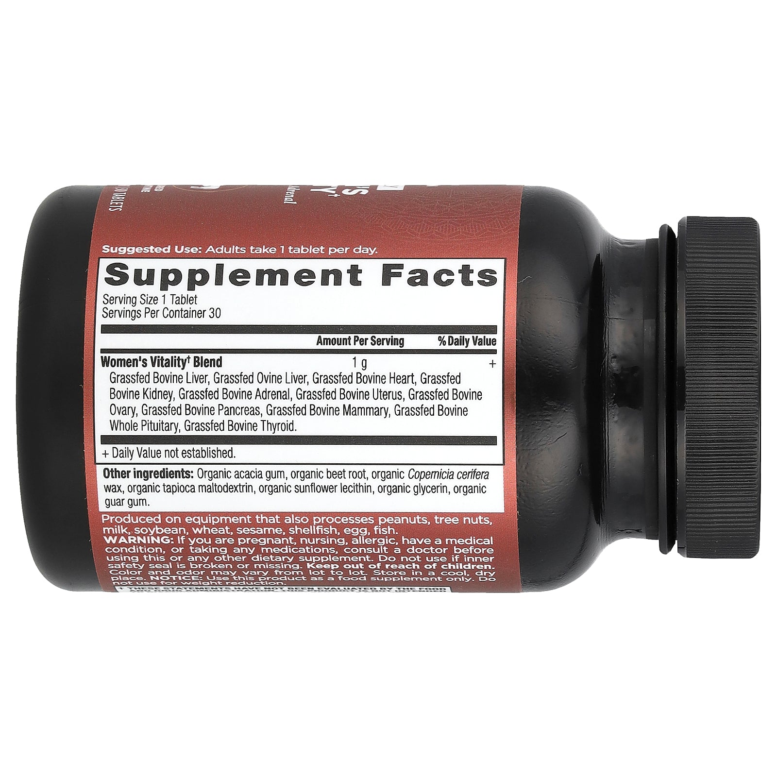 Women's Vitality† Blend Grassfed Bovine Liver, Grassfed Ovine Liver, Grassfed Bovine Heart, Grassfed Bovine Kidney, Grassfed Bovine Adrenal, Grassfed Bovine Uterus, Grassfed Bovine Ovary, Grassfed Bovine Pancreas, Grassfed Bovine Mammary, Grassfed Bovine Whole Pituitary, Grassfed Bovine Thyroid. |
