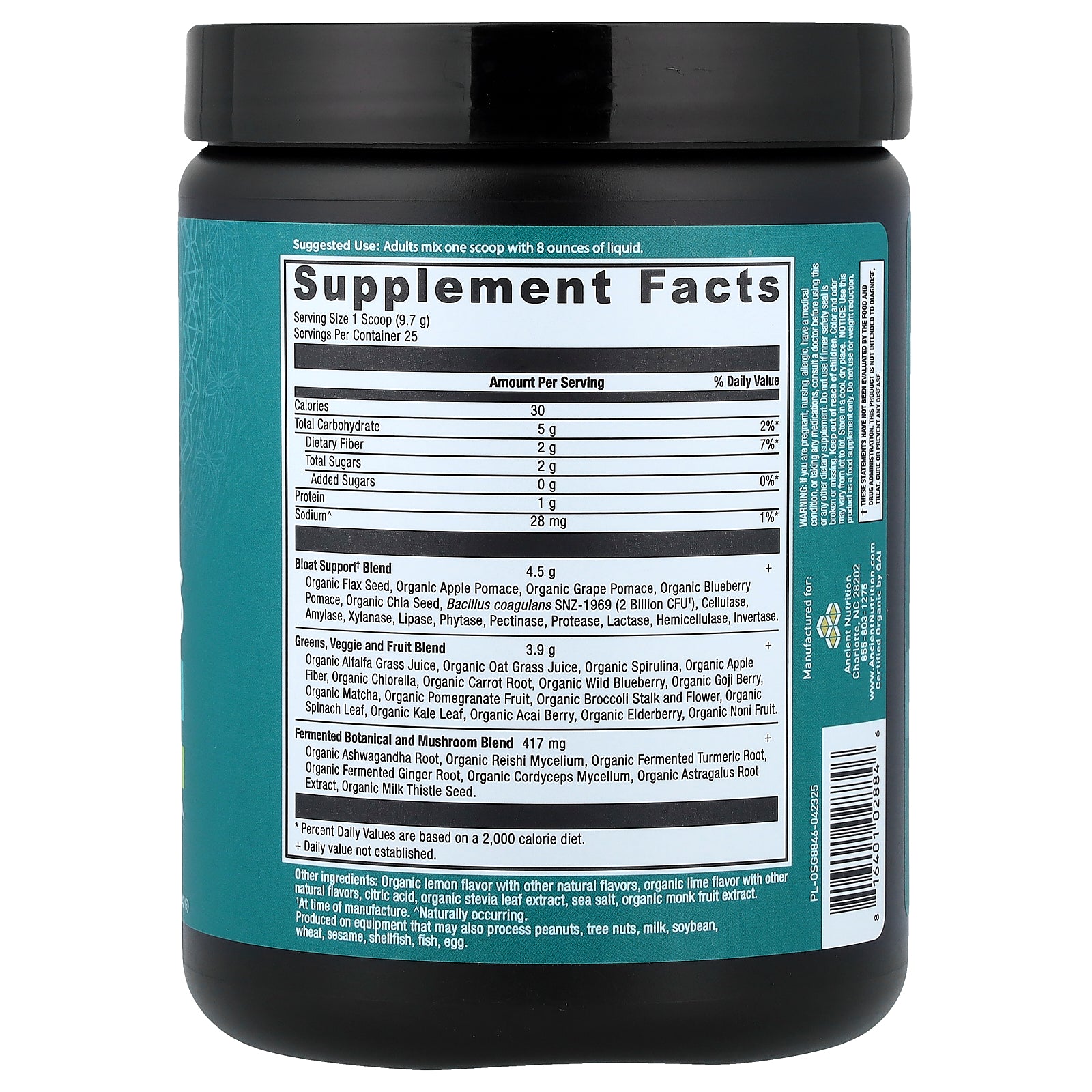 Bloat Support Blend Organic Flax Seed, Organic Apple Pomace, Organic Grape Pomae, Organic Blueberry Pomace, Organic Chia Seed, Bacillus coagulans SNZ-1969 (2 Billion CFU¹), Cellulase, Amylase, Xylanase, Lipase, Phytase, Pectinase, Protease, Lactase, Hemicellulase, Invertase |