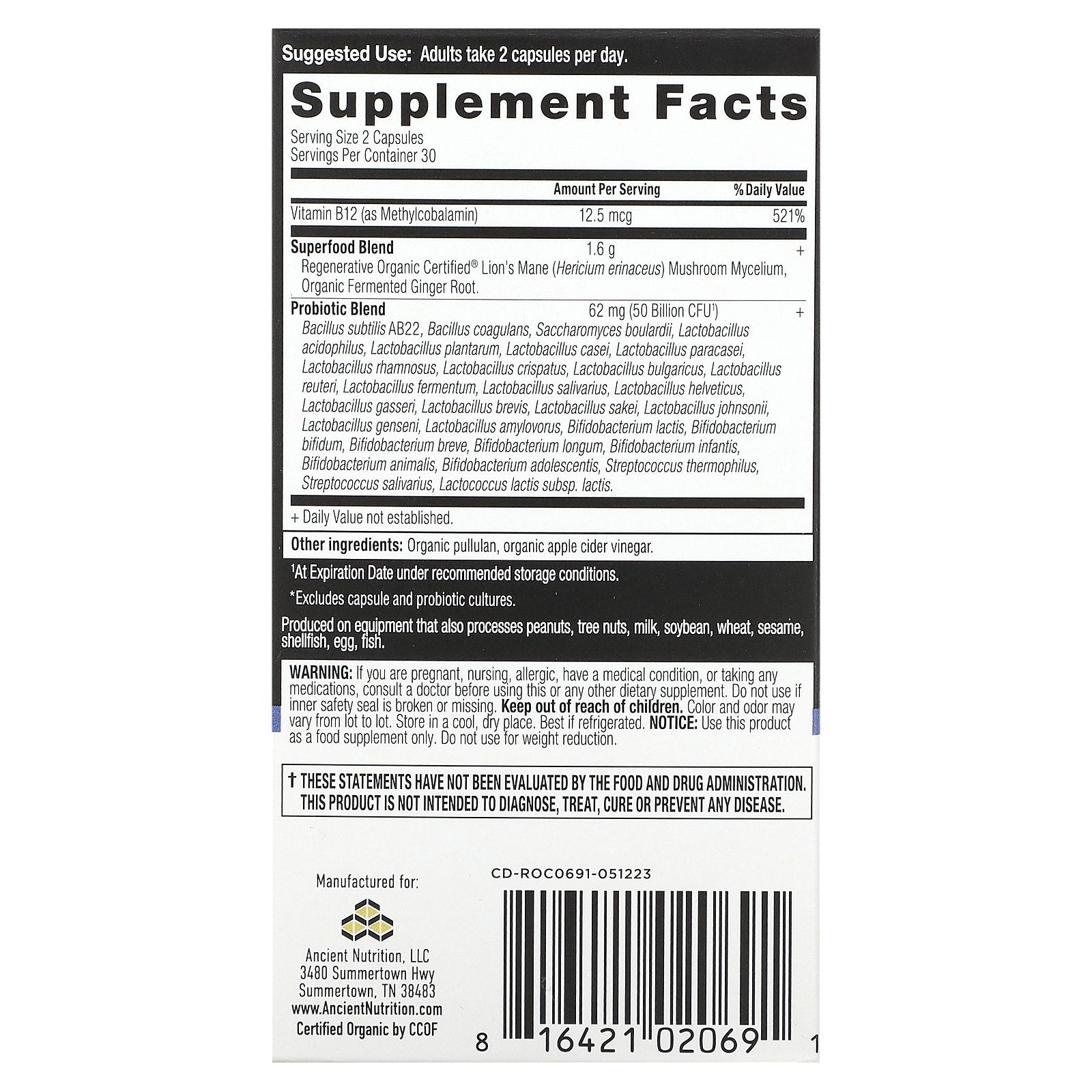 Superfood Blend Regenerative Organic Certified® Lion's Mane (Hericium erinaceus) Mushroom Mycelium, Organic Fermented Ginger Root. |