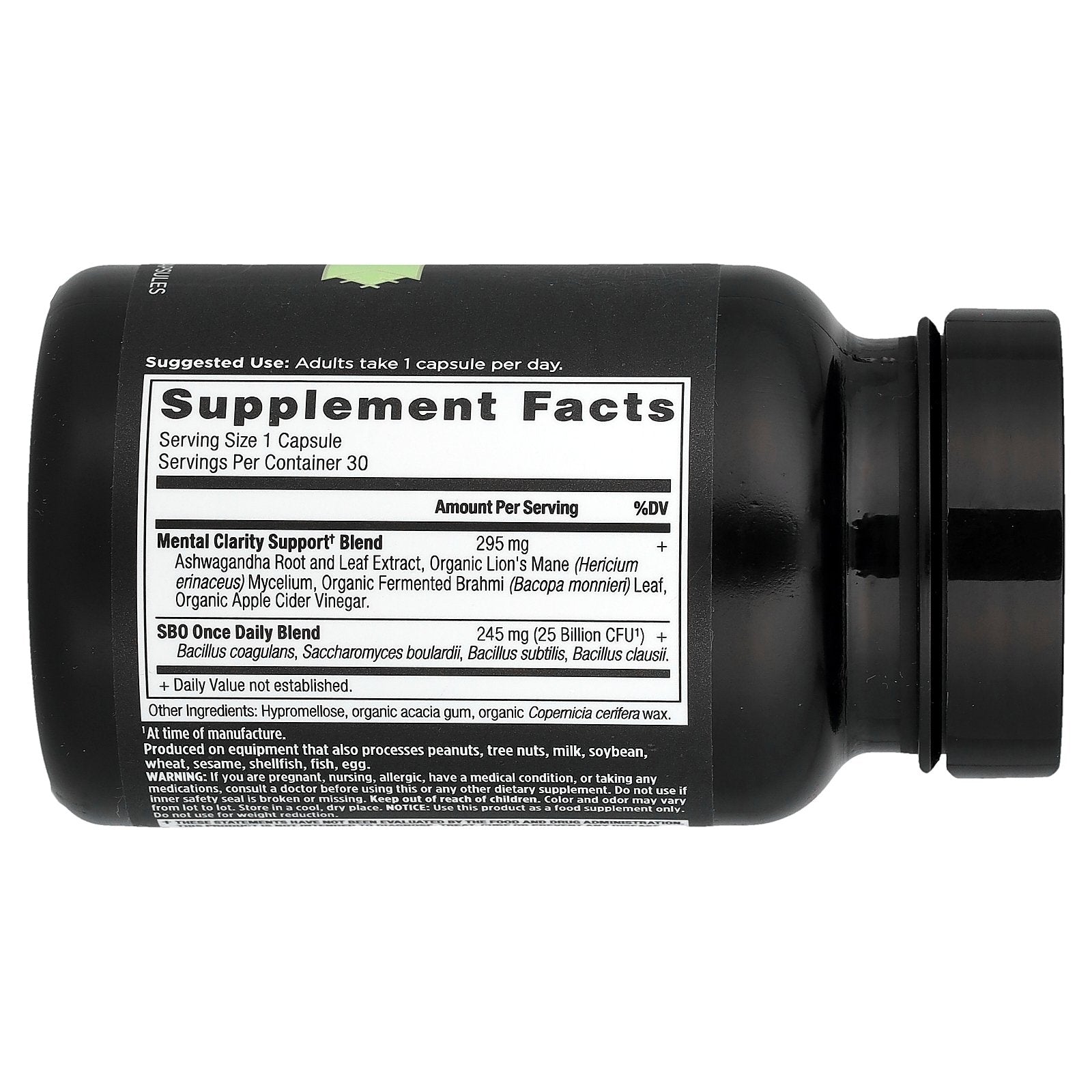 Mental Clarity Support Blend† Ashwagandha Root and Leaf Extract, Organic Lion's Mane (Hericium erinaceus) Mycelium, Organic Fermented Brahmi (Bacopa monnieri) Leaf, Organic Apple Cider Vinegar. |