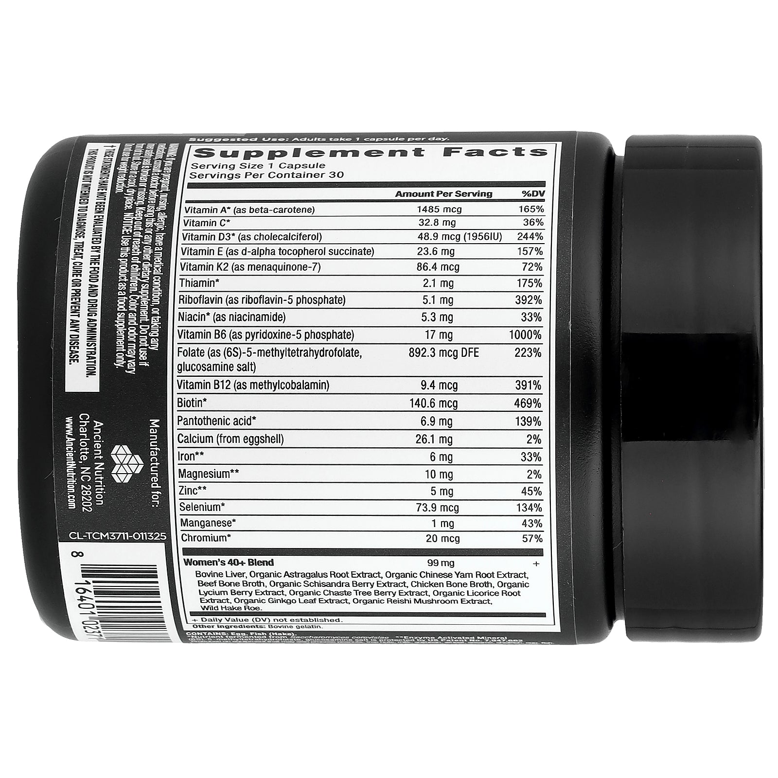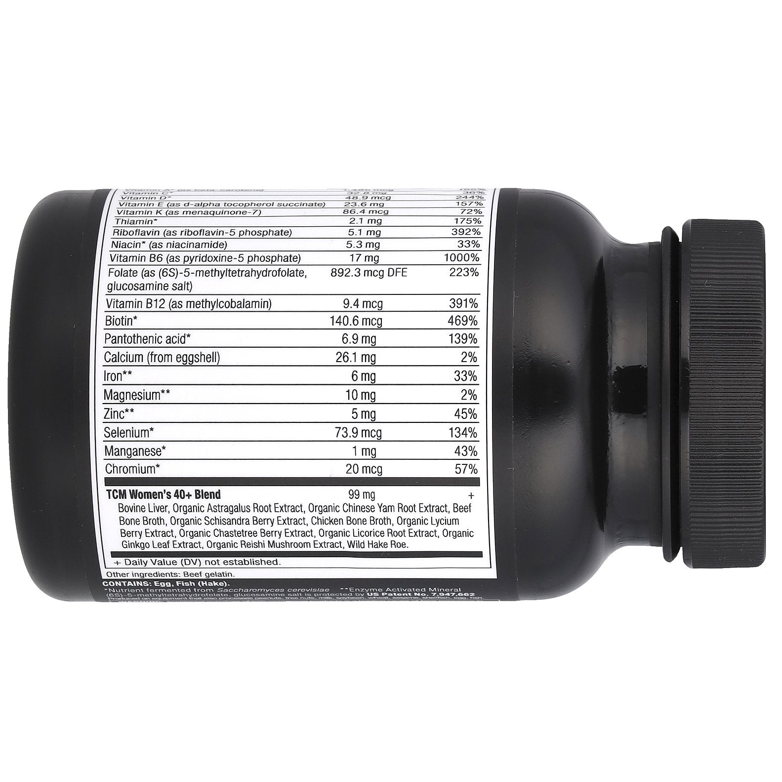 Women's 40+ Blend Bovine Liver, Organic Astragalus Root Extract, Organic Chinese Yam Root Extract, Beef Bone Broth, Organic Schisandra Berry Extract, Chicken Bone Broth, Organic Lycium Berry Extract, Organic Chaste Tree Berry Extract, Organic Licorice Root Extract, Organic Ginkgo Leaf Extract, Organic Reishi Mushroom Extract, Wild Hake Roe |