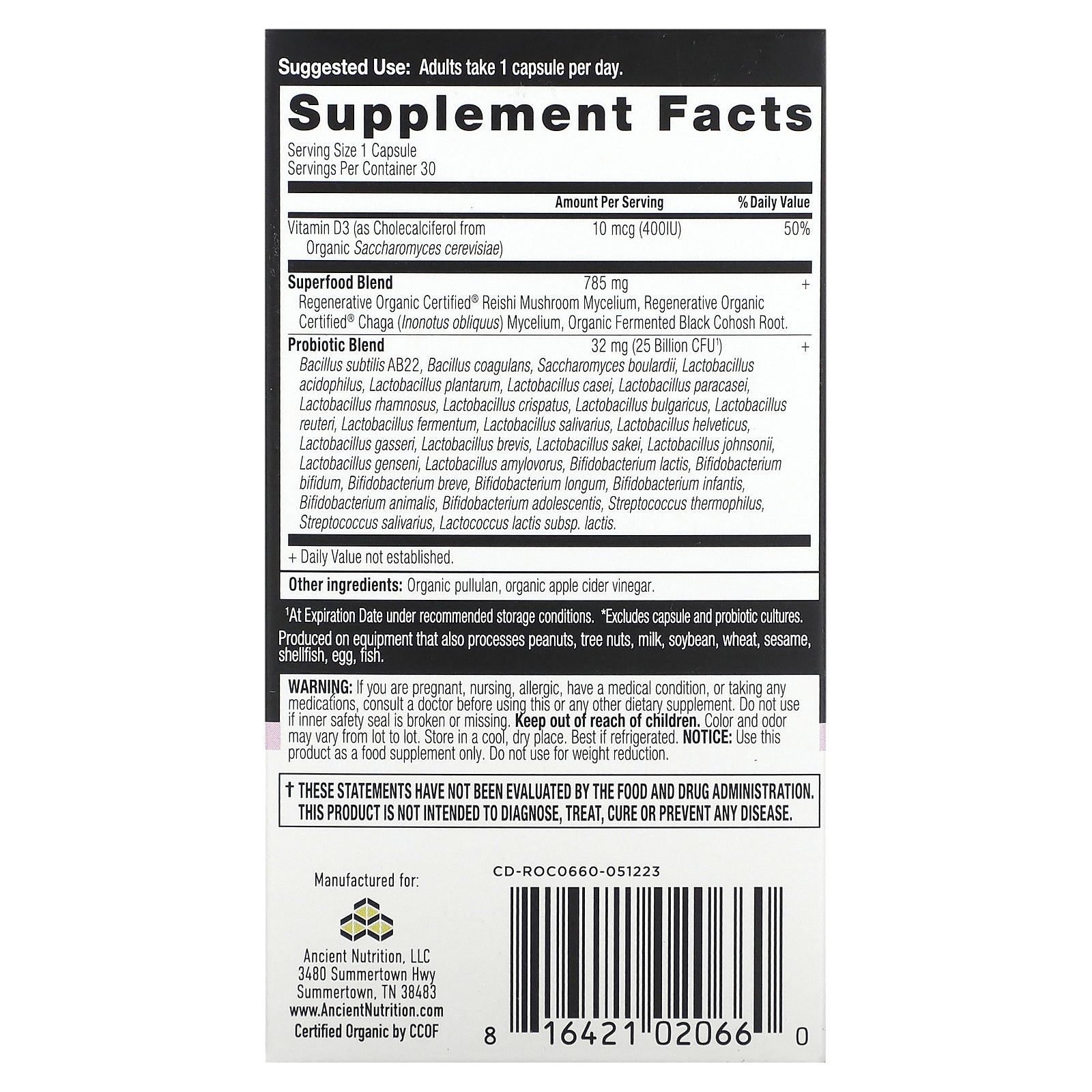 Superfood Blend: Regenerative Organic Certified® Reishi Mushroom Mycelium, Regenerative Organic Certified® Chaga (Inonotus obliquus) Mycelium, Organic Fermented Black Cohosh Root. |