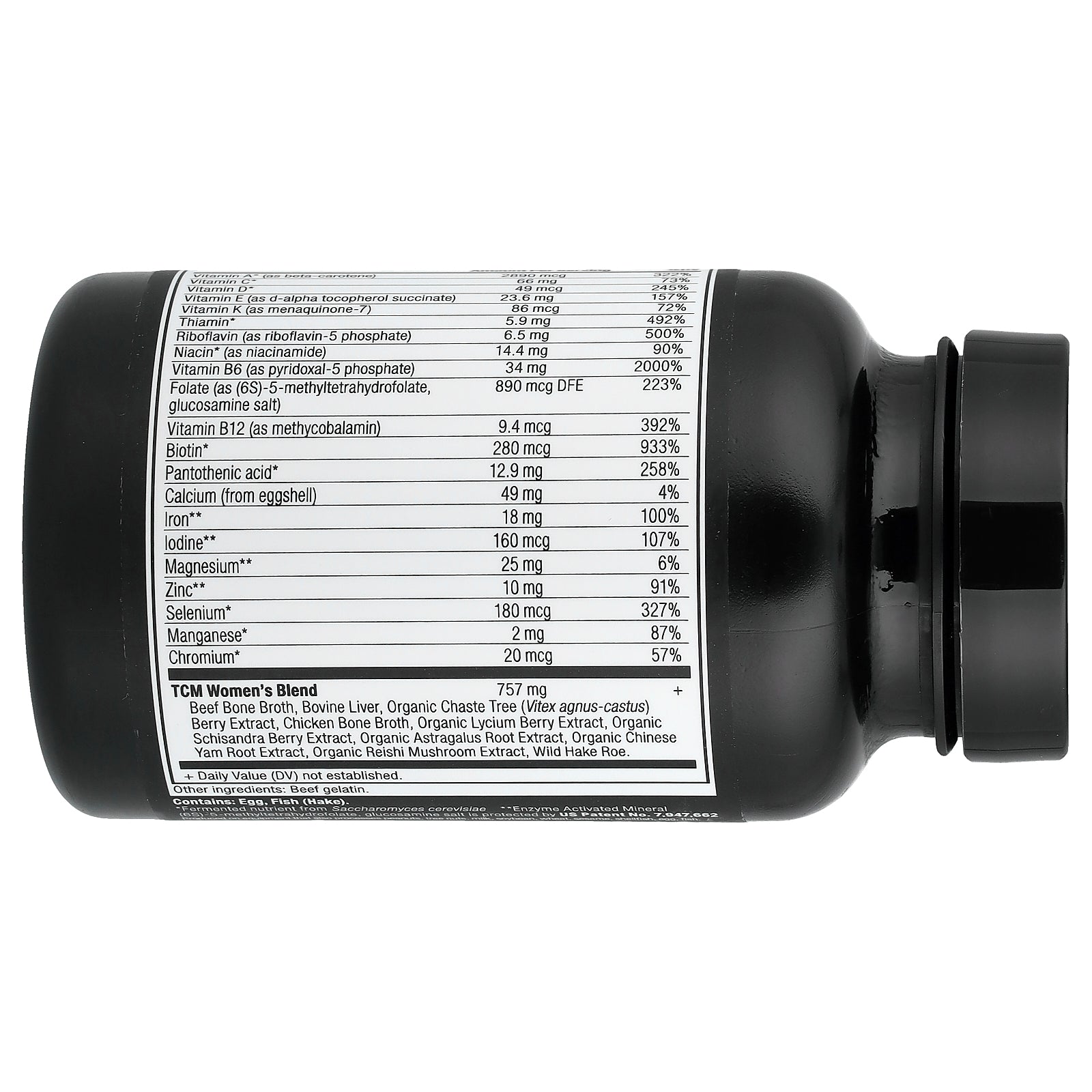 TCM Women's Blend Beef Bone Broth, Bovine Liver, Organic Chaste Tree (Vitex agnus-castus) Berry Extract, Chicken Bone Broth, Organic Lycium Berry Extract, Organic Schisandra Berry Extract, Organic Astragalus Root Extract, Organic Chinese Yam Root Extract, Organic Reishi Mushroom Extract, Wild Hake Roe. |