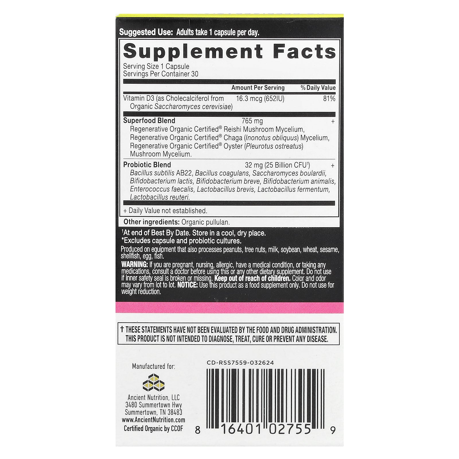 Key Ingredients: Clinically studied probiotics including resilient SBOs (Soil Based Organisms) that survive and thrive in the harsh conditions of the gut. Also featuring prebiotics (fuel for probiotics) and postbiotics (beneficial byproducts).