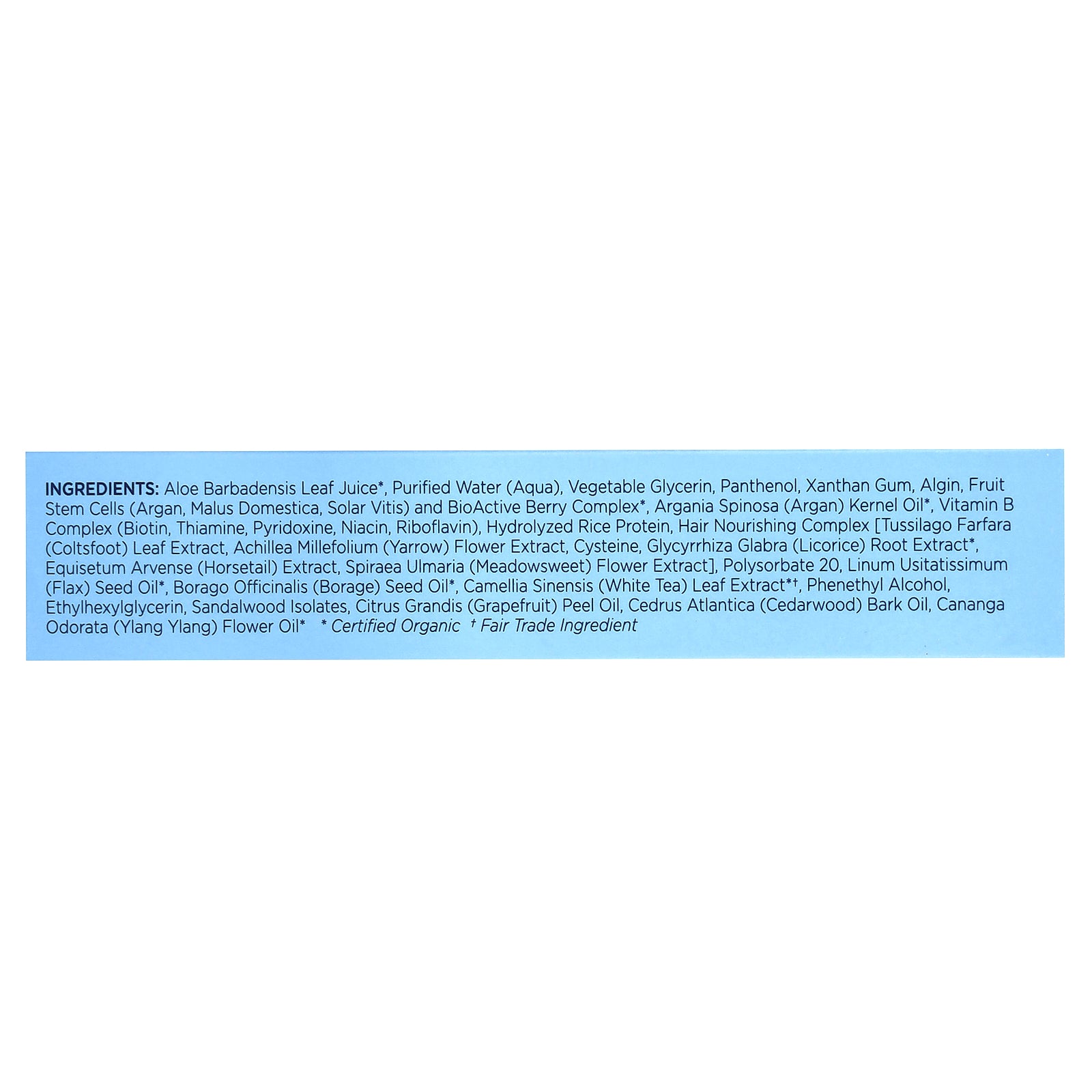 Aloe barbadensis leaf juice*, purified water (aqua), vegetable glycerin, panthenol, xanthan gum, sodium alginate (algin), fruit stem cells (argan, malus domestica, solar vitis) and bioactive 8 berry complex*, argania spinosa (argan) kernel oil*, vitamin B complex (biotin, thiamine, pyridoxine, niacin, riboflavin), hydrolyzed rice protein, hair regeneration complex [tussilago farfara (coltsfoot) leaf extract, achillea millefolium (yarrow) flower extract, cysteine, glycyrrhiza glabra (licorice) root extract*, equisetum arvense (horsetail) extract, spiraea ulmaria (meadowsweet) flower extract], hydrolyzed soy protein, polysorbate 20, linum usitatissimum (flax) seed oil*, borago officinalis (borage) seed oil*, camellia sinensis (white tea) leaf extract*†, hibiscus sabdariffa flower extract*†, phenethyl alcohol, ethylhexylglycerin, sandalwood isolates, citrus grandis (grapefruit) peel oil, cedrus atlantica (cedarwood) bark oil, cananga odorata (ylang ylang) flower oil*