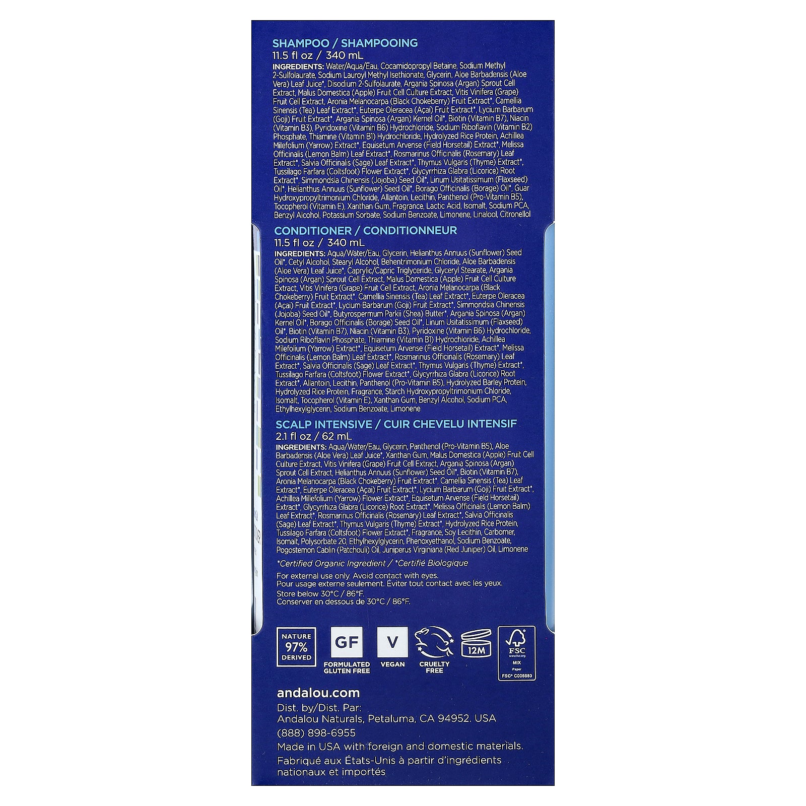 Scalp Intensive: Water, glycerin, panthenol (pro-vitamin b5), aloe barbadensis (aloe vera) leaf juice*, xanthan gum, malus domestica (apple) fruit cell culture extract, vitis vinifera (grape) fruit cell extract, argania spinosa (argan) sprout cell extract, helianthus annuus (sunflower) seed oil*, biotin (vitamin b7), aronia melanocarpa (black chokeberry) fruit extract*, camellia sinensis (tea) leaf extract*, euterpe oleracea (açai) fruit extract*, lycium barbarum (goji) fruit extract*, achillea millefolium (yarrow) flower extract*, equisetum arvense (field horsetail) extract*, glycyrrhiza glabra (licorice) root extract*, melissa officinalis (lemon balm) leaf extract*, rosmarinus officinalis (rosemary) leaf extract*, salvia officinalis (sage) leaf extract*, thymus vulgaris (thyme) extract*, hydrolyzed rice protein, tussilago farfara (coltsfoot) flower extract*, fragrance, soy lecithin, carbomer, isomalt, polysorbate 20, ethylhexylglycerin, phenoxyethanol, sodium benzoate, pogostemon cablin (patchouli) oil, juniperus virginiana (red juniper) oil, limonene.