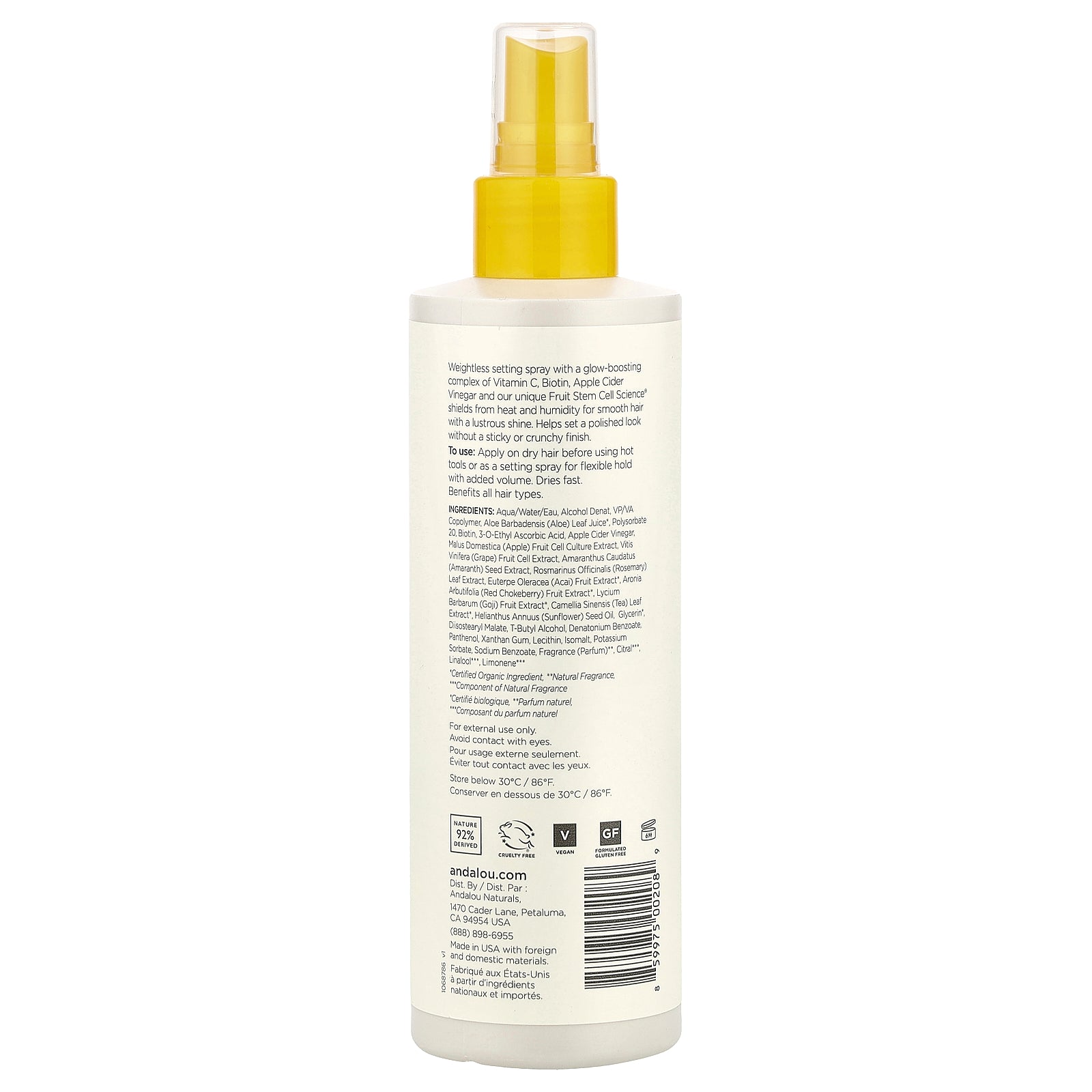 Weightless setting spray with a glow-boosting complex of Vitamin C, Biotin, Apple Cider Vinegar and our unique Fruit Stem Cell Science® shields from heat and humidity for smooth hair with a lustrous shine. Helps set a polished look without a sticky or crunchy finish.