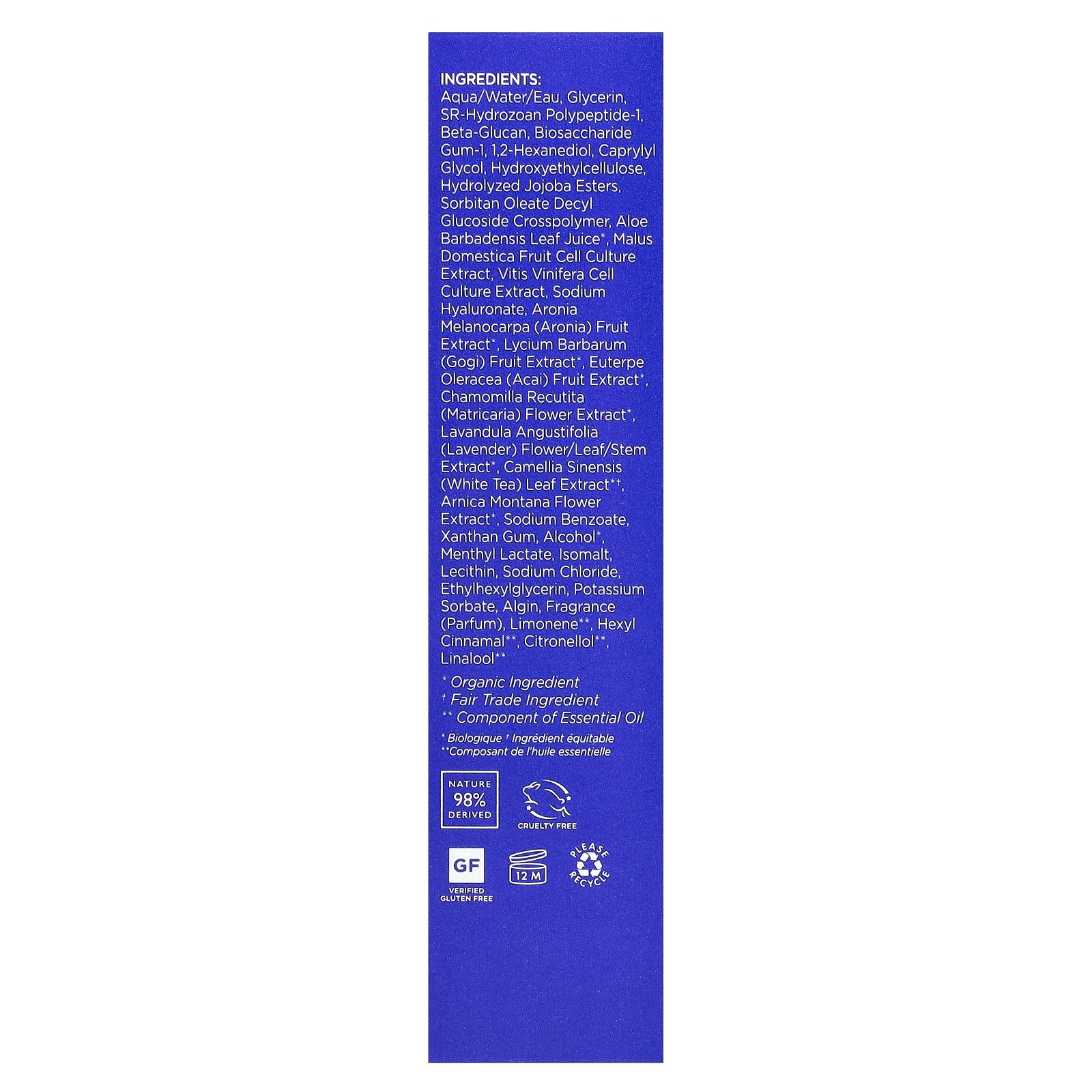 Water, glycerin, sr-hydrozoan polypeptide-1, beta-glucan, biosaccharide gum-1, 1,2-hexanediol, caprylyl glycol, hydroxyethylcellulose, hydrolyzed jojoba esters, sorbitan oleate decyl glucoside crosspolymer, aloe barbadensis leaf juice*, malus domestica fruit cell culture extract, vitis vinifera cell culture extract, sodium hyaluronate, aronia melanocarpa (aronia) fruit extract*, lycium barbarum (gogi) fruit extract*, euterpe oleracea (acai) fruit extract*, chamomilla recutita (matricaria) flower extract*, lavandula angustifolia (lavender) flower/leaf/stem extract*, camellia sinensis (white tea) leaf extract*†, arnica montana flower extract*, sodium benzoate, xanthan gum, alcohol*, menthyl lactate, isomalt, lecithin, sodium chloride, ethylhexylglycerin, potassium sorbate, algin, fragrance, limonene**, hexyl cinnamal**, citronellol**, linalool**.