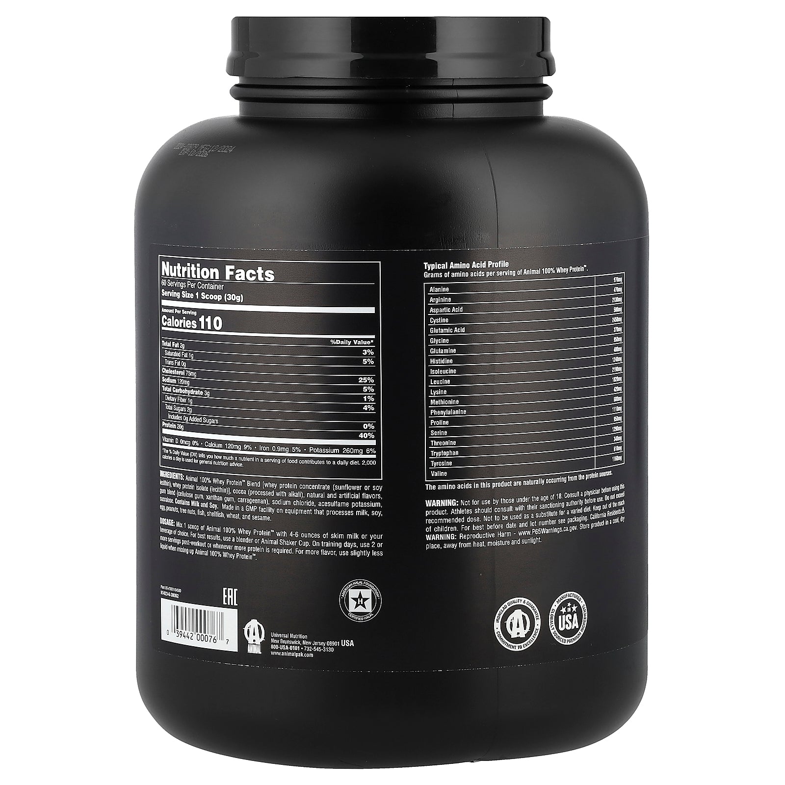 Animal 100% whey protein™ blend [whey protein concentrate (sunflower or soy lecithin), whey protein isolate (lecithin)], cocoa (processed with alkali), natural and artificial flavors, gum blend (cellulose gum, xanthan gum, carrageenan), sodium chloride, acesulfame potassium, sucralose.