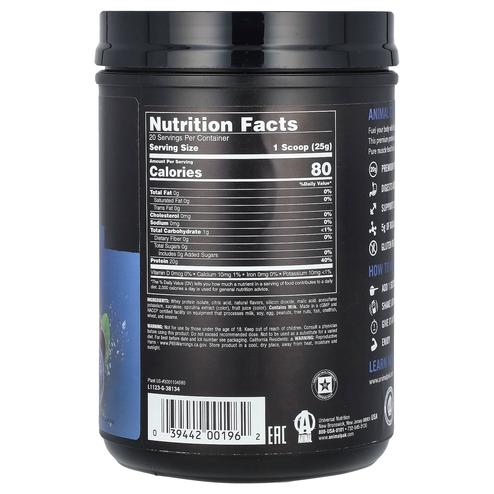 Whey protein isolate, citric acid, natural flavors, silicon dioxide, malic acid, acesulfame potassium, sucralose, spirulina extract (color), fruit juice (color).