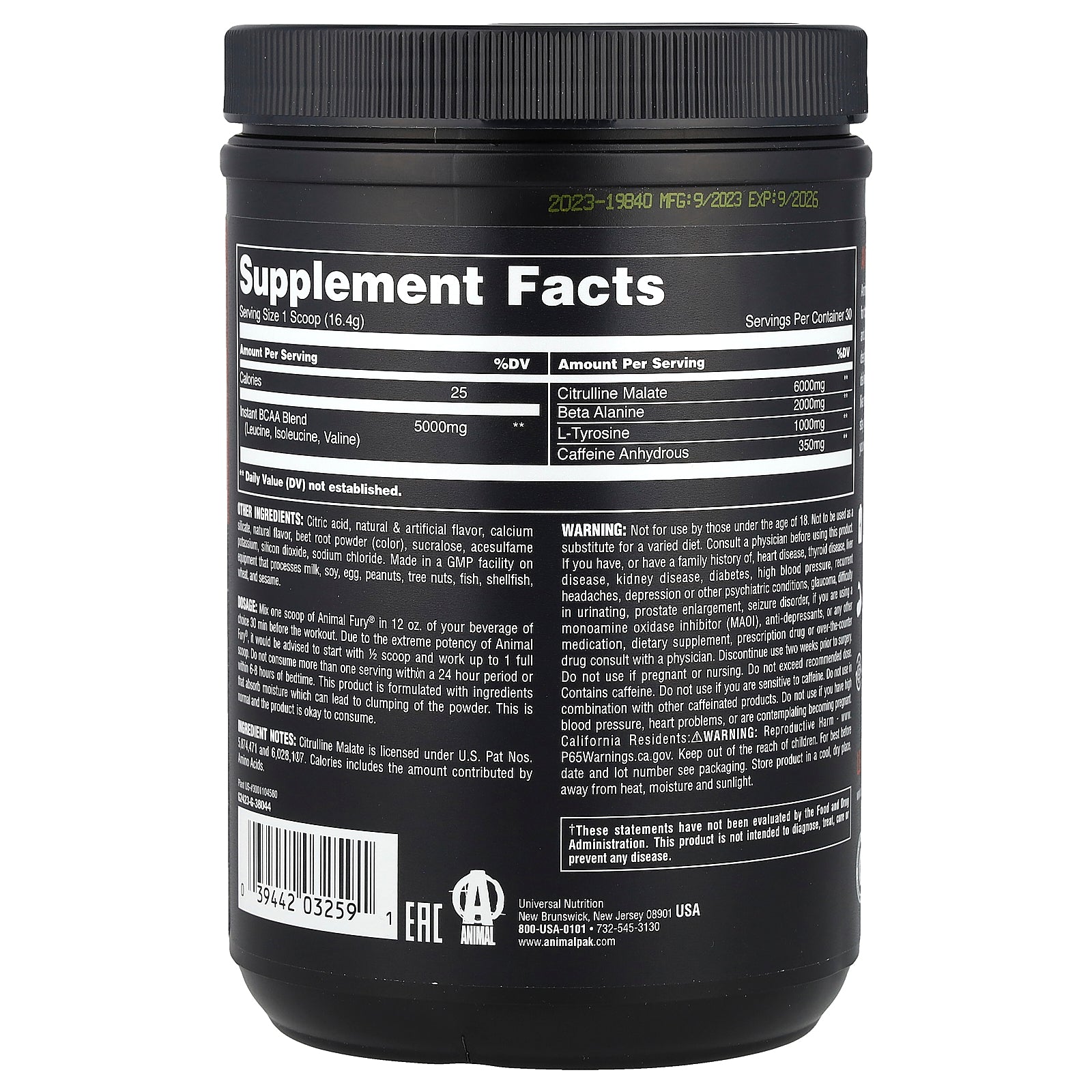 Mix one scoop of Animal Fury® in 12 oz. of your beverage of choice 30 min before the workout. Due to the extreme potency of Animal Fury®, it would be advised to start with 1/2 scoop and work up to 1 full scoop. Do not consume more than one serving within a 24 hour period or within 6-8 hours of bedtime.