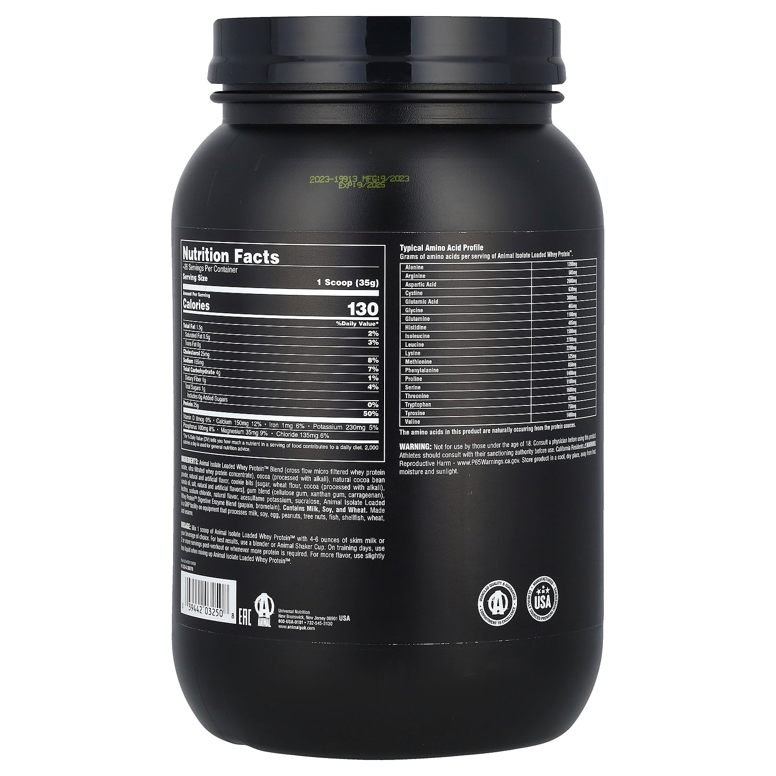 Animal Isolate Loaded Whey Protein™ Blend (cross flow micro filtered whey protein isolate, ultra filtrated whey protein concentrate), cocoa (processed with alkali), natural cocoa bean powder, natural and artificial flavor, cookie bits [sugar, wheat flour, cocoa (processed with alkali), canola oil, salt, natural and artificial flavors], gum blend (cellulose gum, xanthan gum, carrageenan), lecithin, sodium chloride, natural flavor, acesulfame potassium, sucralose, Animal Isolate Loaded Whey Protein™ digestive enzyme blend (papain, bromelain).