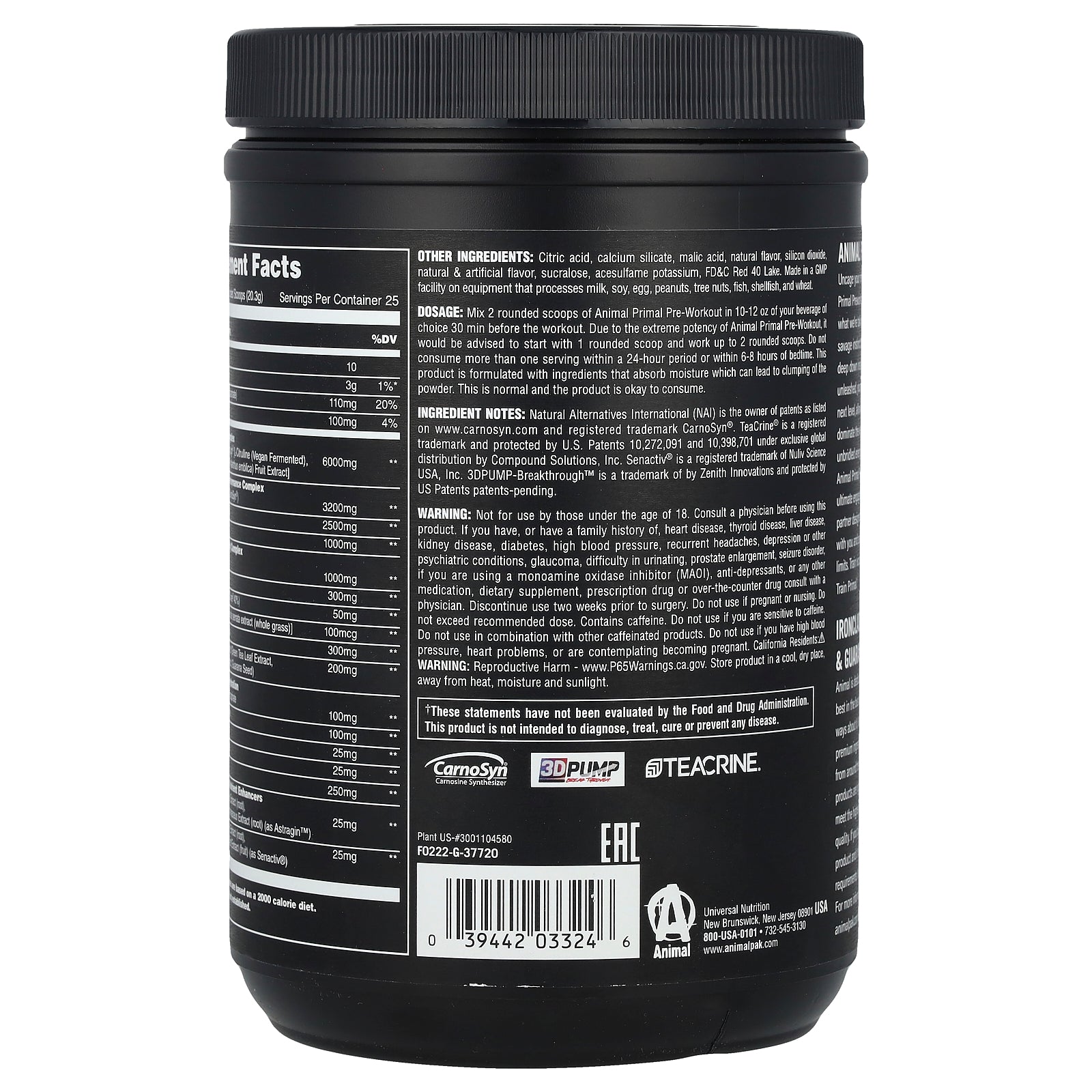 Uncage your inner Animal with Primal Preworkout. You know what we're talking about-that savage instinct that you possess deep down inside, and when it's unleashed, your training goes next level, allowing you to dominate the weights with unbridled energy and intensity, Animal Primal Preworkout is the ultimate ergogenic training partner designed to keep up with you and push you to your limits. Train vicious. Train hard. Train Primal.