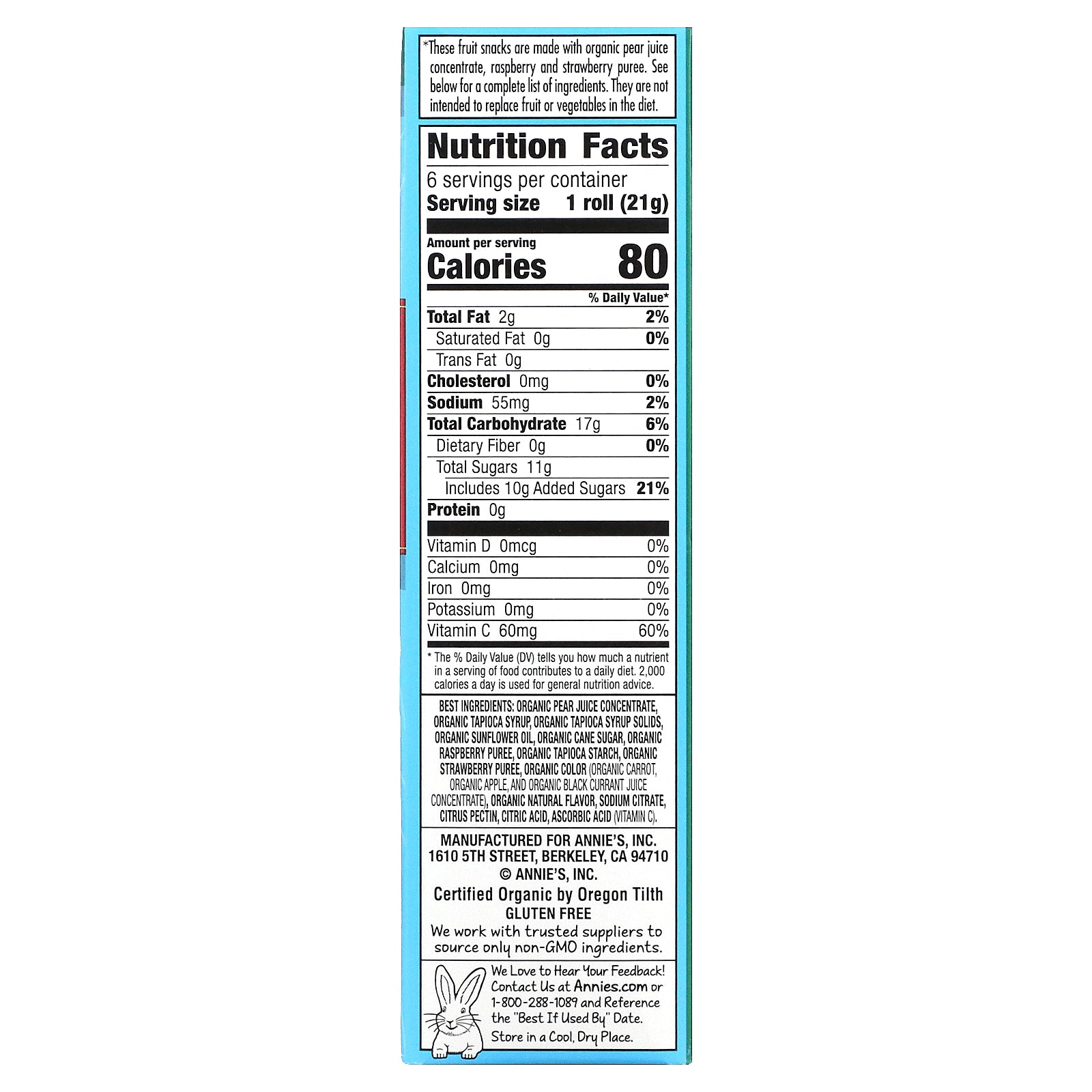 *These fruit snacks are made with organic pear juice concentrate, raspberry and strawberry puree. See below for a complete list of ingredients. They are not intended to replace fruit or vegetables in the diet.