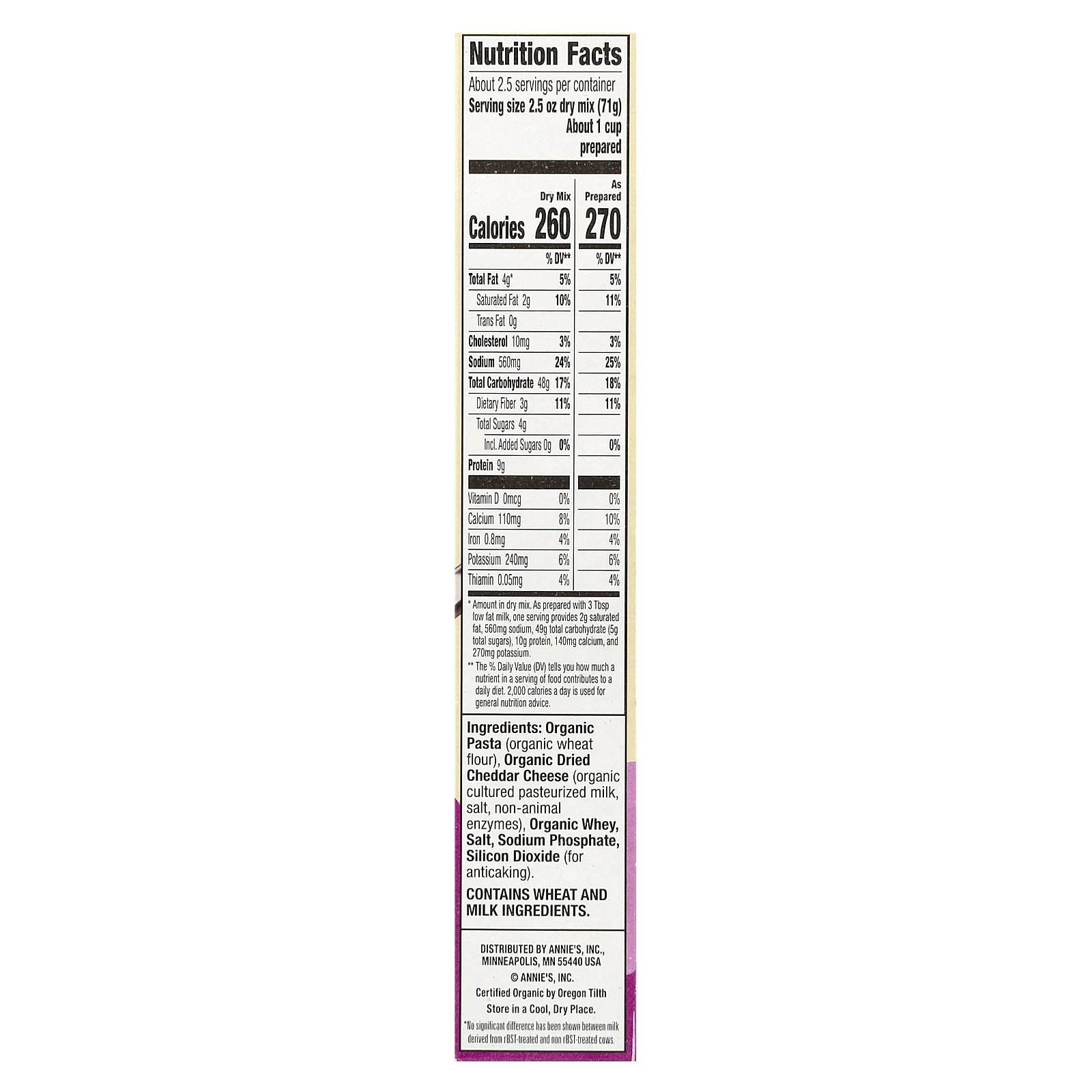 Organic pasta (organic wheat flour), organic dried cheddar cheese (organic cultured pasteurized milk, salt, non-animal enzymes), organic whey, salt, sodium phosphate, silicon dioxide (for anticaking).