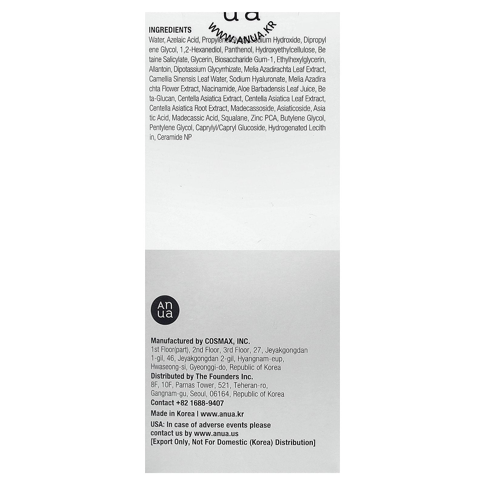 Water, azelaic acid, propylene sodium hydroxide, dipropylene glycol, 1,2-hexanediol, panthenol, hydroxyethylcellulose, betaine salicylate, glycerin, biosaccharide gum-1, ethylhexylglycerin, allantoin, dipotassium glycyrrhizate, melia azadirachta leaf extract, camellia sinensis leaf water, sodium hyaluronate, melia azadirachta flower extract, niacinamide, aloe barbadensis leaf juice, beta-glucan, centella asiatica extract, centella asiatica leaf extract, centella asiatica root extract, madecassoside, asiaticoside, asiatic acid, madecassic acid, squalane, zinc pca, butylene glycol, pentylene glycol, caprylyl/capryl glucoside, hydrogenated lecithin, ceramide np.