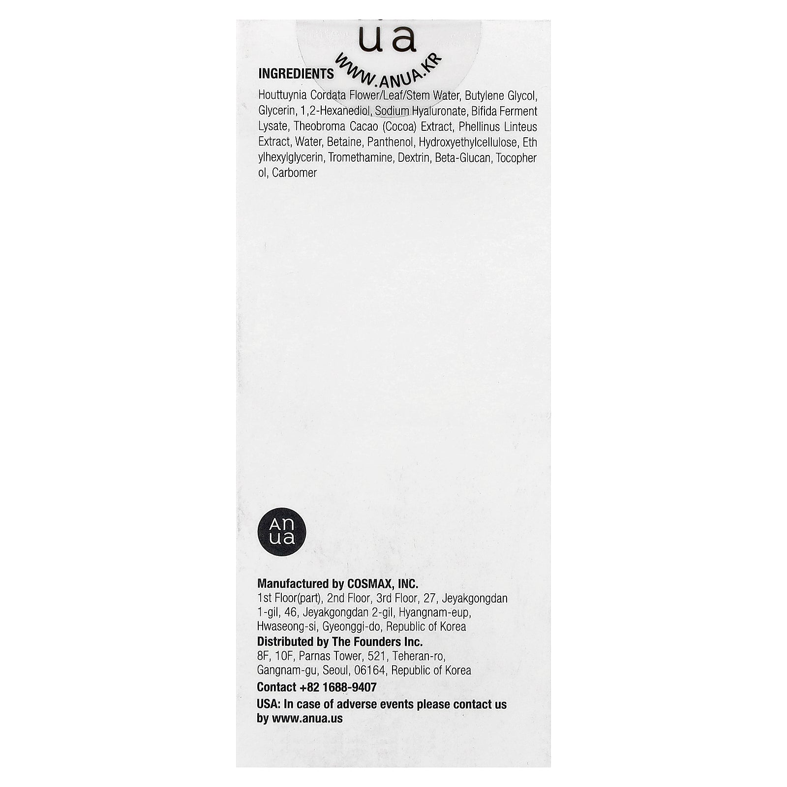 Houttuynia cordata flower/leaf/stem water, butylene glycol, glycerin, 1,2-hexanediol, sodium hyaluronate, bifida ferment lysate, theobroma cacao (cocoa) extract, phellinus linteus extract, water, betaine, panthenol, hydroxyethylcellulose, ethylhexylglycerin, tromethamine, dextrin, beta-glucan, tocopherol, carbomer.