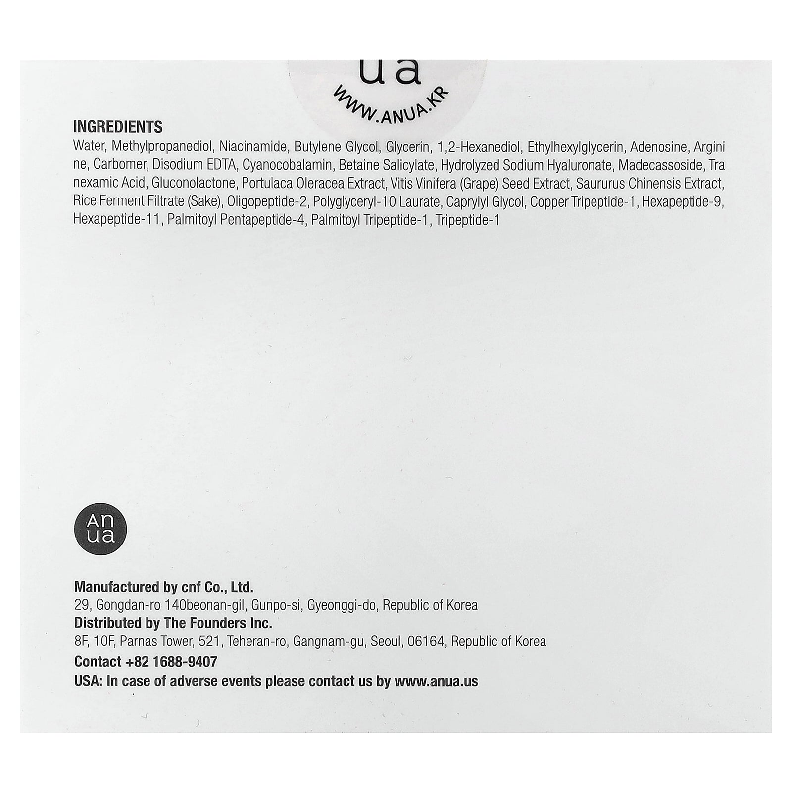 Water, methylpropanediol, niacinamide, butylene glycol, glycerin, 1,2-hexanediol, ethylhexylglycerin, adenosine, arginine, carbomer, disodium edta, cyanocobalamin, betaine salicylate, hydrolyzed sodium hyaluronate, madecassoside, tranexamic acid, gluconolactone, portulaca oleracea extract, vitis vinifera (grape) seed extract, saururus chinensis extract, rice ferment filtrate (sake), oligopeptide-2, polyglyceryl-10 laurate, caprylyl glycol, copper tripeptide-1, hexapeptide-9, hexapeptide-11, palmitoyl pentapeptide-4, palmitoyl tripeptide-1, tripeptide-1.