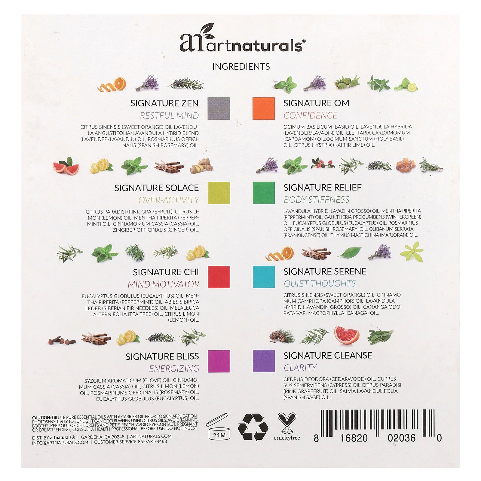 SIGNATURE OM: Ocimum basilicum (basil) oil, lavendula hybrida (lavender/lavadin) oil, elettaria cardamomum (cardamom) oil,ocimum sanctum (holy basil) oil, citrus hystrix (kaffir lime) oil. signature relief body stiffness lavandula hybrid (lavadin grosso) oil, mentha piperita (peppermint) oil, gaultheria procumbens (wintergreen) oil, eucalyptus globulus (eucalyptus) oil, rosmarinus officinalis (spanish rosemary) oil, olibanum serrata (frankincense) oil, thymus mastichina (marjoram) oil.
