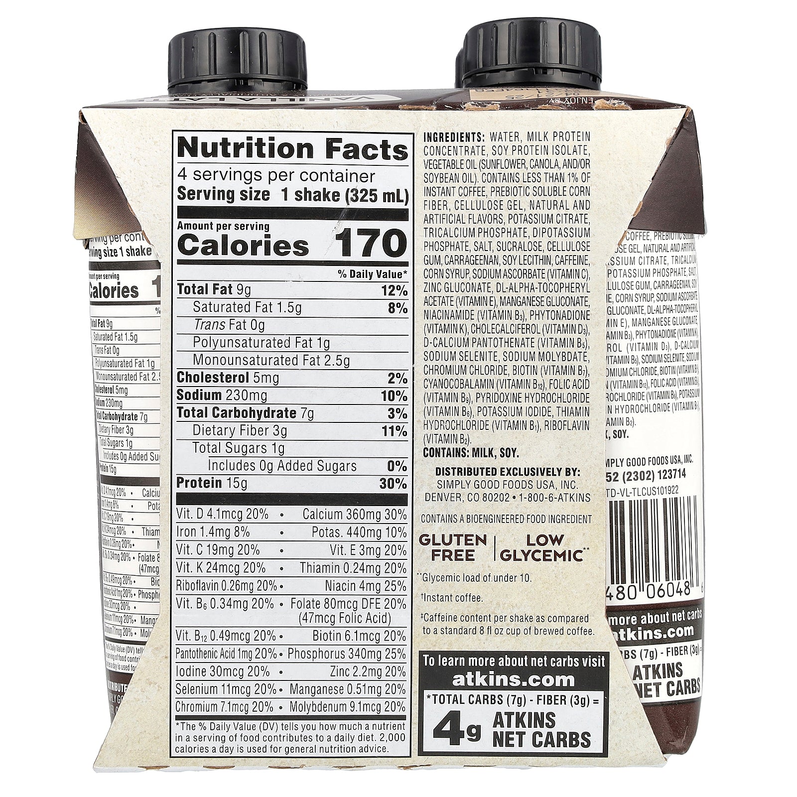 Water, milk protein concentrate, soy protein isolate, vegetable oil (sunflower, canola, and/or soybean oil). Contains less than 1% of instant coffee, prebiotic soluble corn fiber, cellulose gel, natural and artificial flavors, potassium citrate, tricalcium phosphate, dipotassium phosphate, salt, sucralose, cellulose gum, carrageenan, soy lecithin, caffeine, corn syrup, sodium ascorbate (vitamin c), zinc gluconate, dl-alpha-tocopheryl acetate (vitamin e), manganese gluconate, niacinamide (vitamin b3), phytonadione (vitamin k), cholecalciferol (vitamin d3), d-calcium pantothenate (vitamin b5), sodium selenite, sodium molybdate, chromium chloride, biotin (vitamin b7), cyanocobalamin (vitamin b12), folic acid (vitamin b9), pyridoxine hydrochloride (vitamin b6), potassium iodide, thiamin hydrochloride (vitamin b1), riboflavin (vitamin b2).