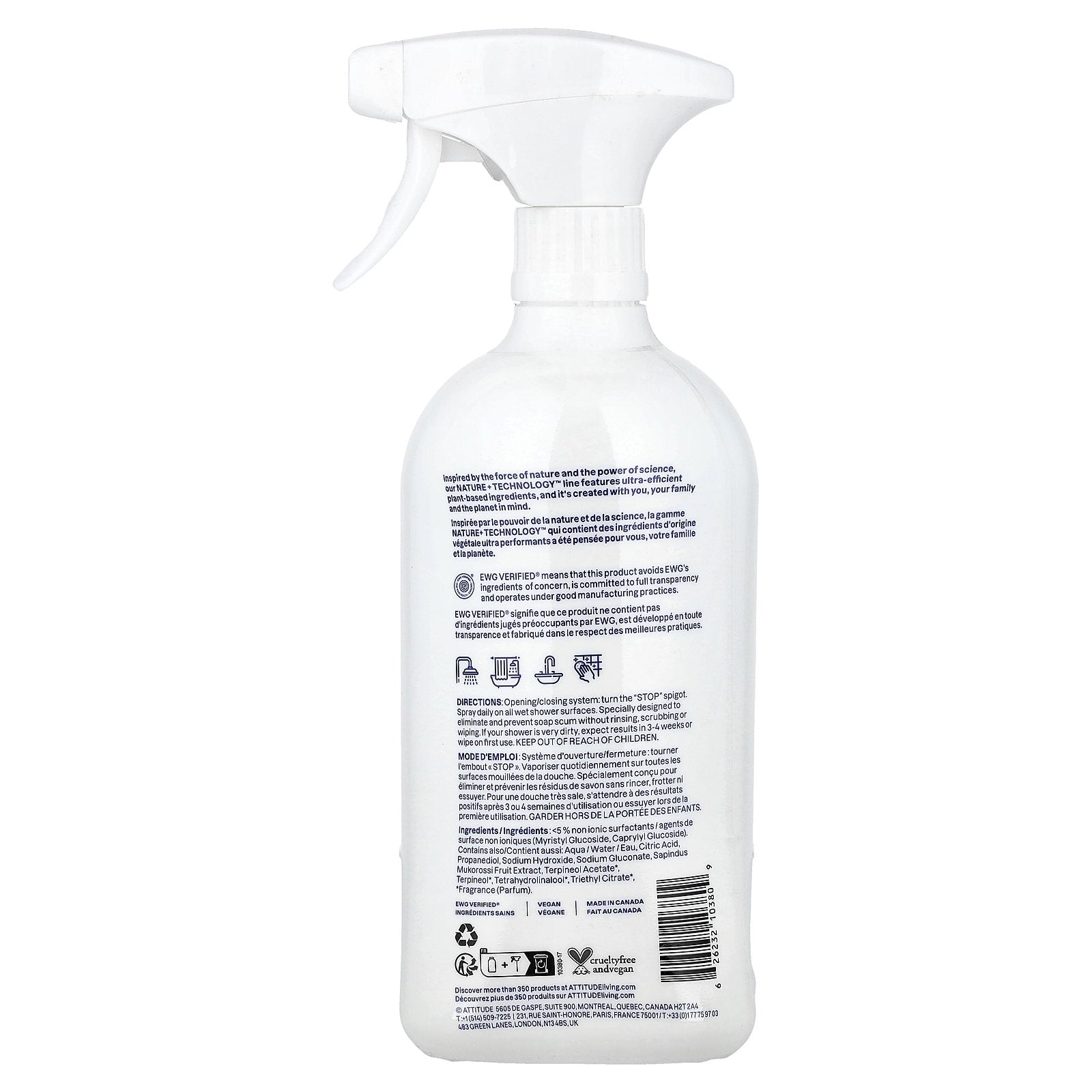 Opening/closing system: turn the "STOP" spigot. Spray daily on all wet shower surfaces. Specially designed to eliminate and prevent soap scum without rinsing, scrubbing or wiping. If your shower is very dirty, expect results in 3-4 weeks or wipe on first use.